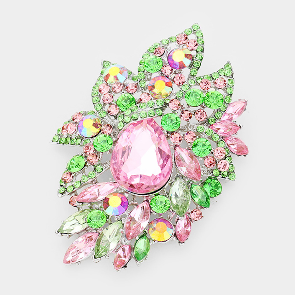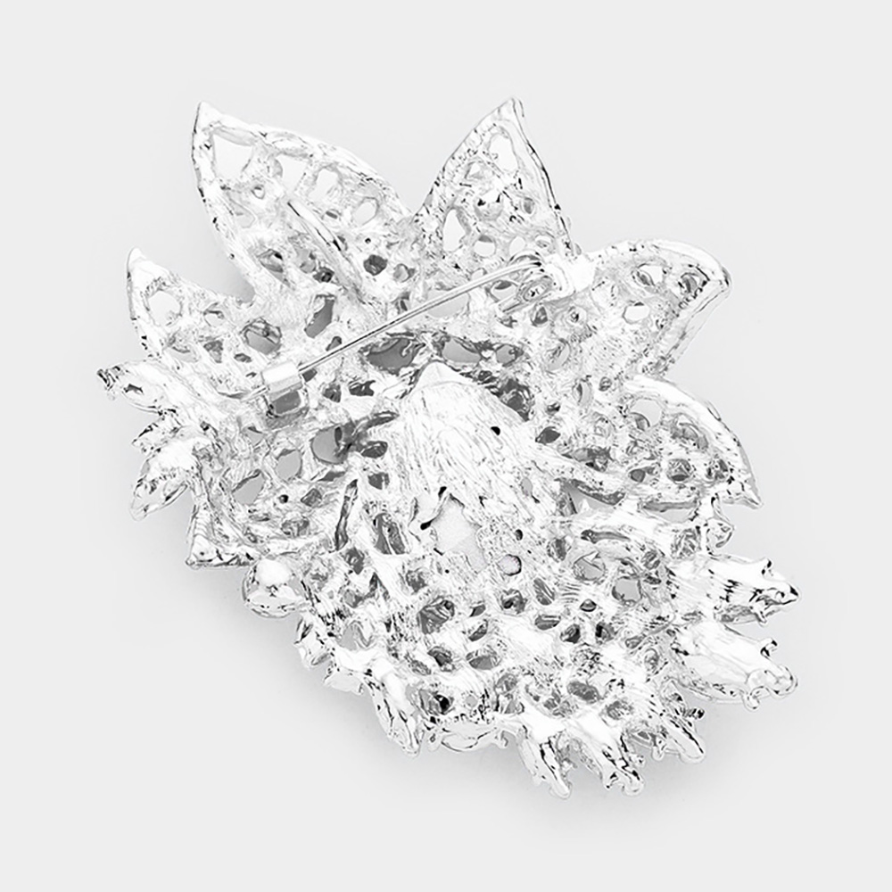 Flower Stone Cluster Pointed Glass Stone Embellished Leaf Pin Brooch