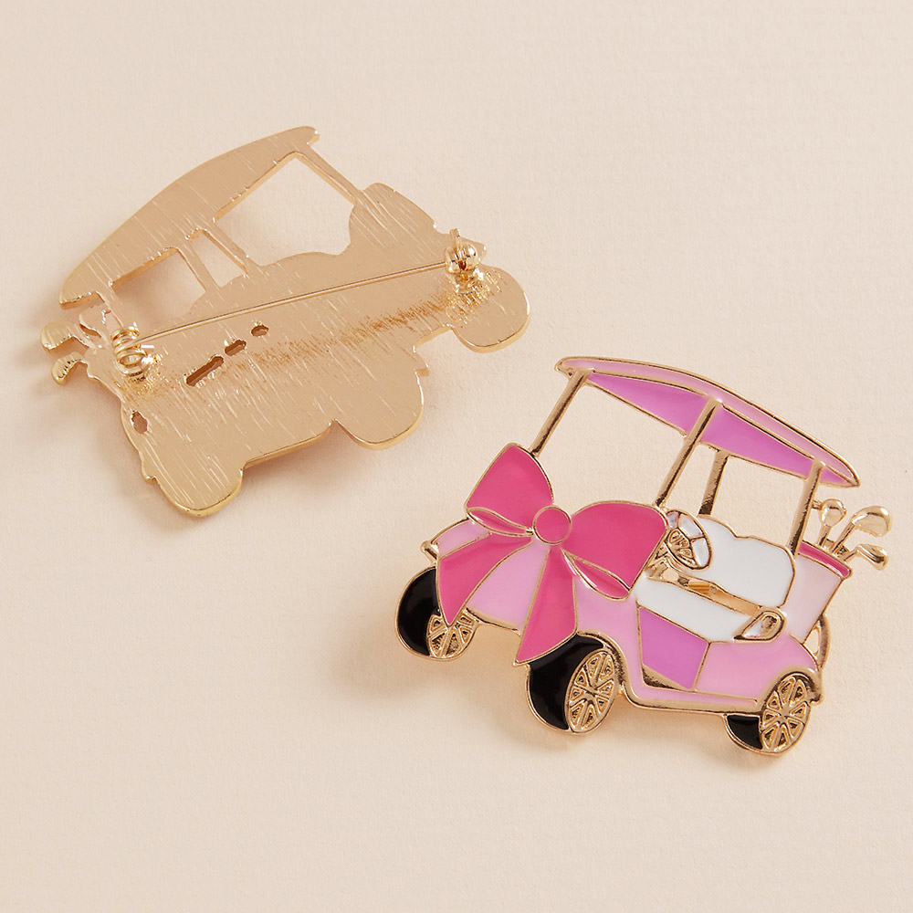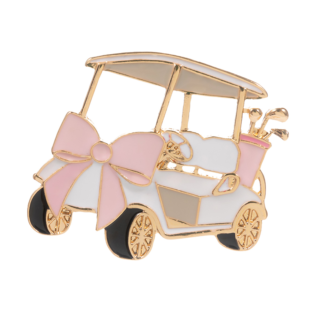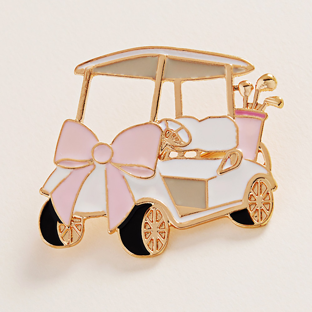 • Adorable enamel pin featuring a golf cart with bow and club bag details. Ideal for golf lovers to accessorize bags, hats, or jackets. Fun and stylish gift idea.