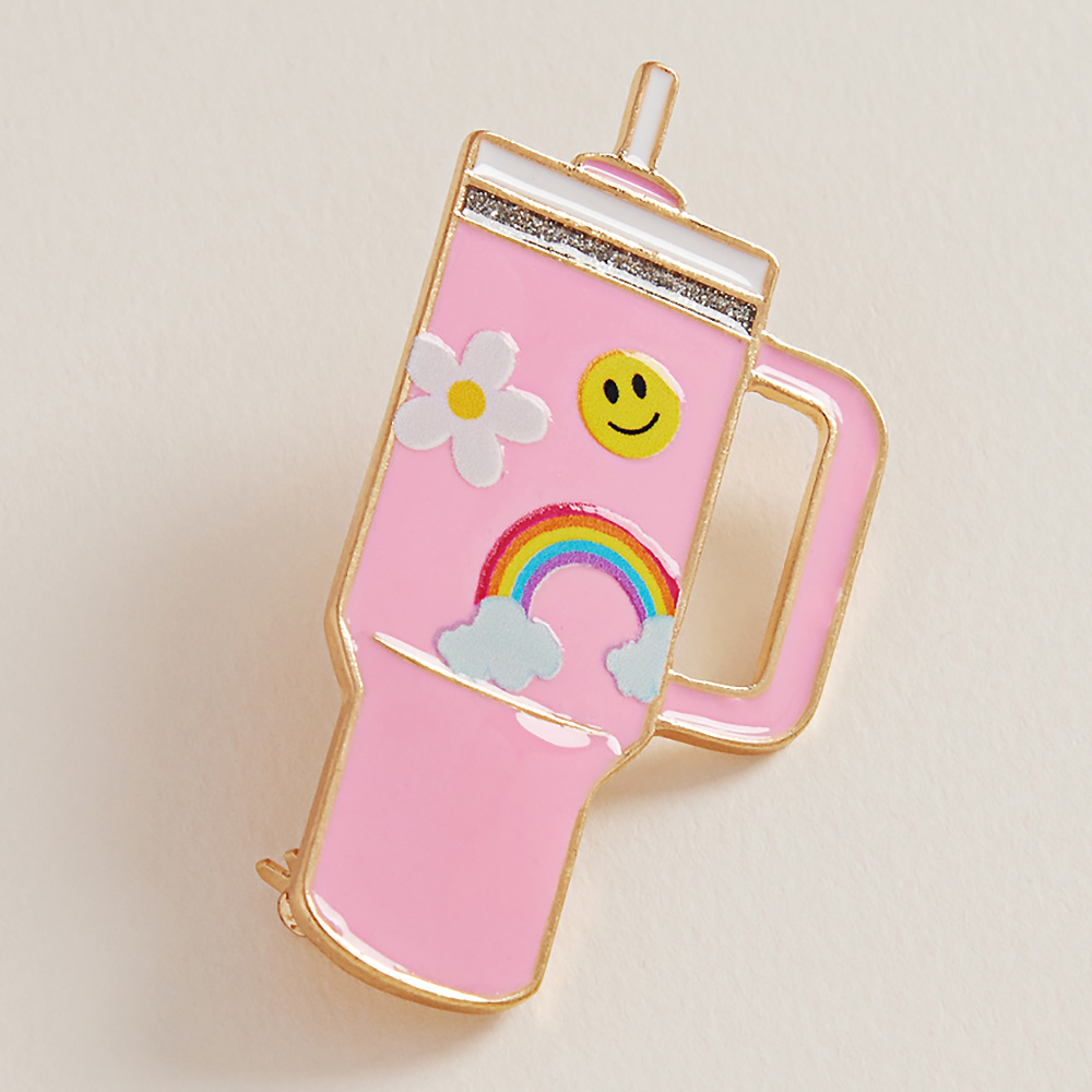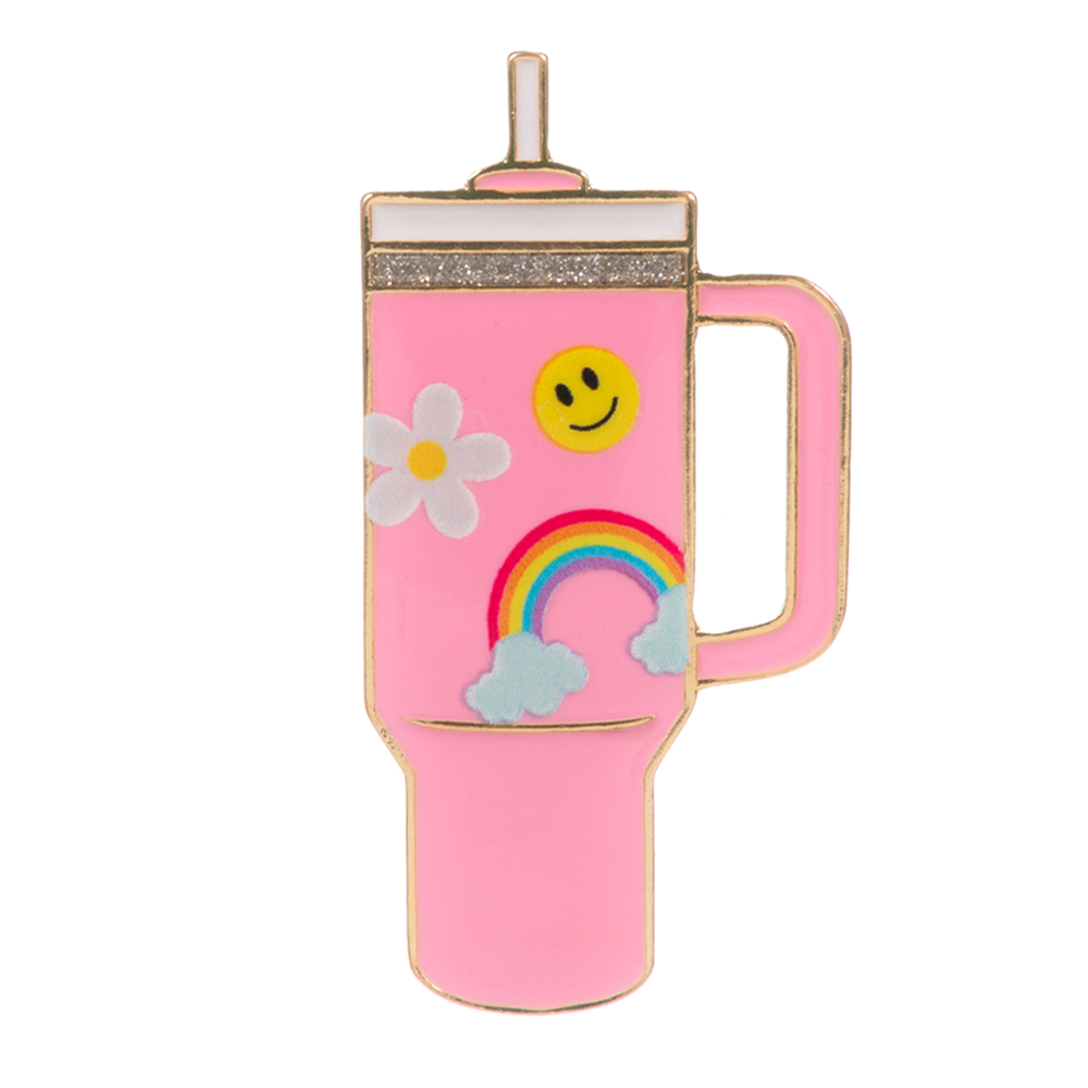 • Cute enamel pin shaped like a tumbler with smiley, rainbow, and flower designs. A fun and uplifting accessory perfect for bags, jackets, or teacher gifts.