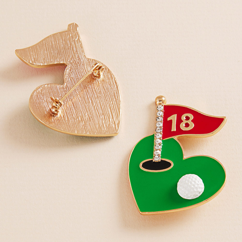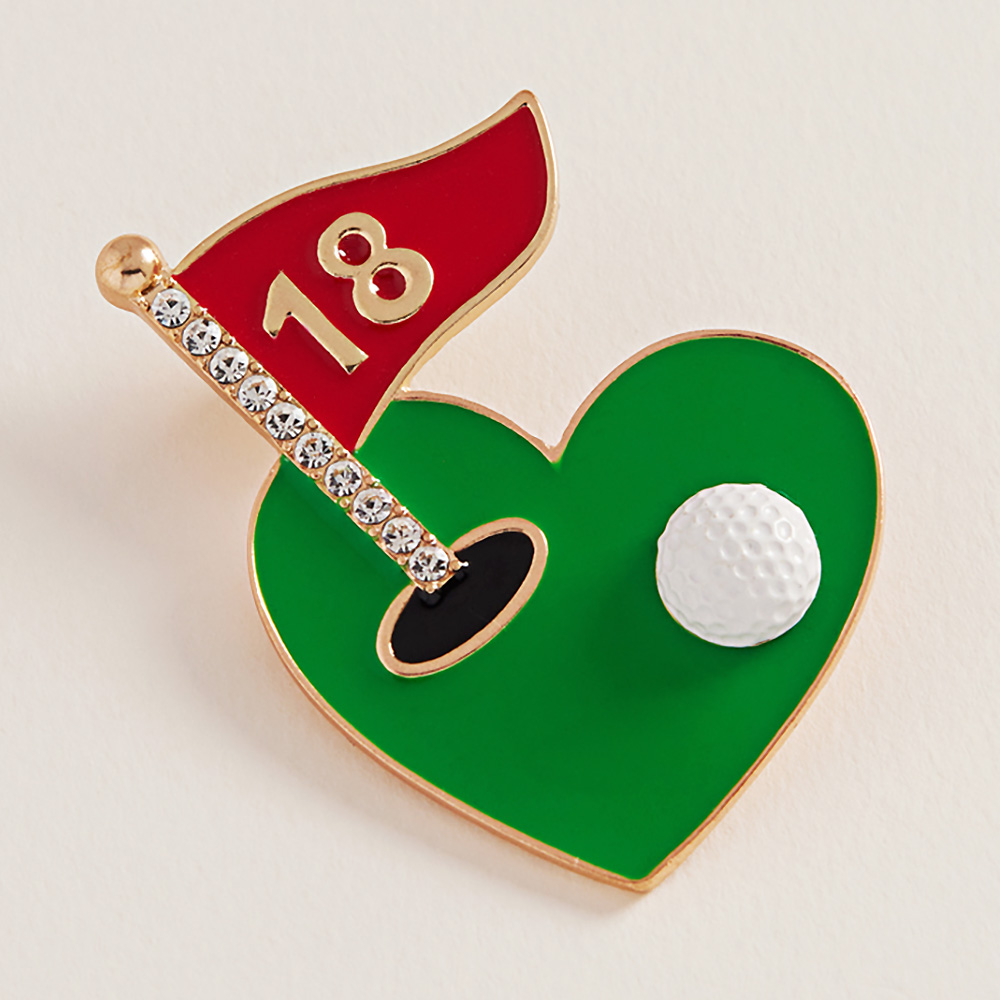Details • Size : 1.5" X 1.8" • Pin Brooch • Charming enamel pin featuring a heart-shaped green, golf ball, and rhinestone flag detail. Perfect for golf lovers to decorate bags, hats, or jackets. Fun gift idea. • Lead and Nickel Compliant