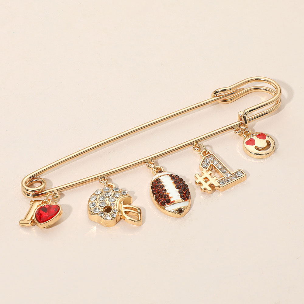 Details • Size : 1.1" L, 4" X 0.8" • Pin Brooch • Sporty brooch styled like a safety pin, featuring dangling football-themed charms including a helmet, ball, and fan symbols. A fun accent for bags, jackets, or accessories to show your game day passion. • Lead and Nickel Compliant