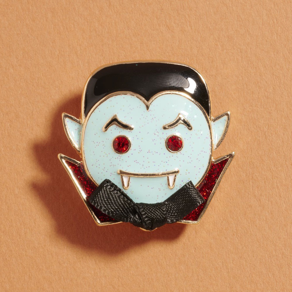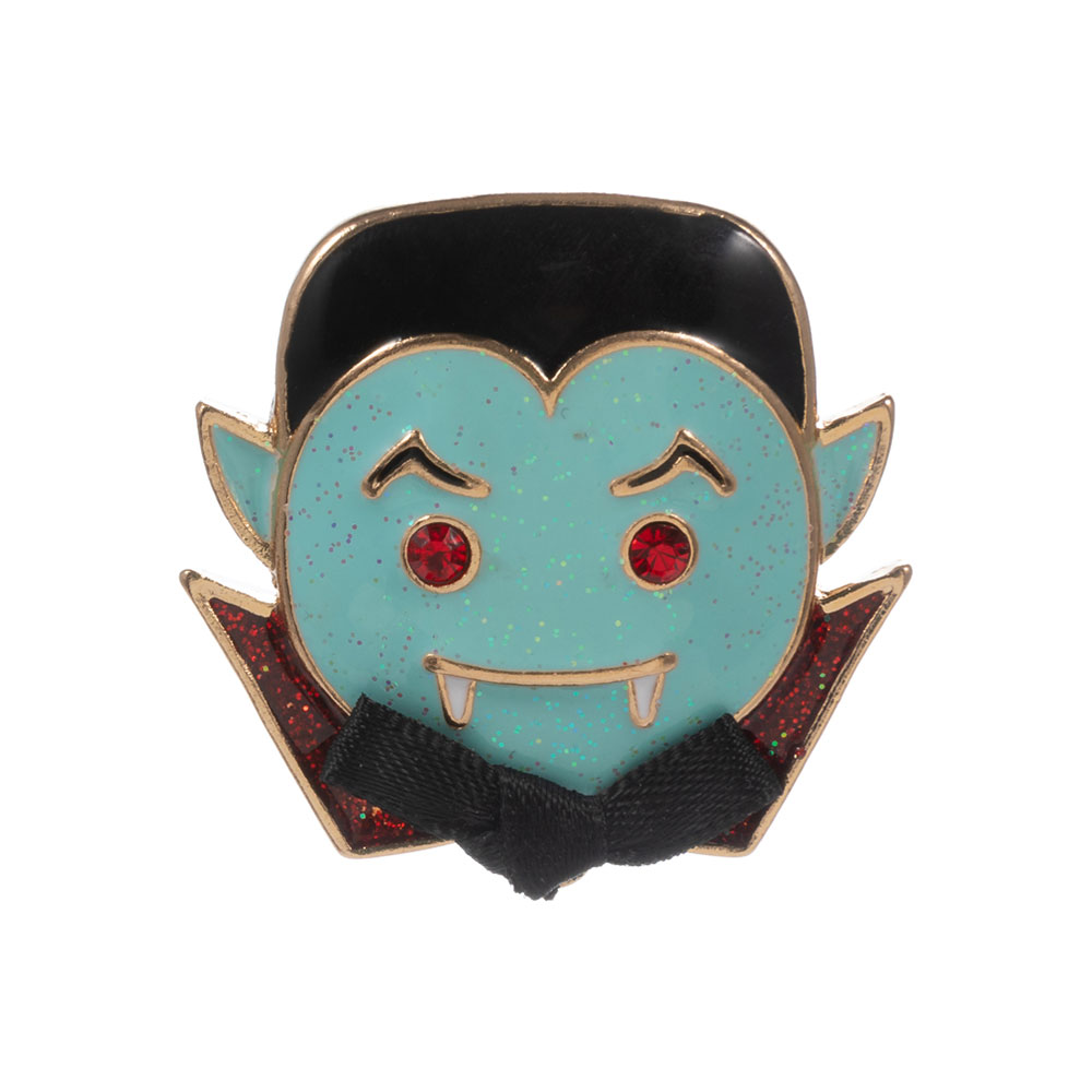 Details • Size : 1.4" X 1.5" • Pin Brooch • Show off spooky charm with this Dracula face Halloween pin, complete with glimmering red eyes, fangs, and a tiny bow tie. A playful and festive accent for Halloween outfits, hats, or bags. • Lead and Nickel Compliant
