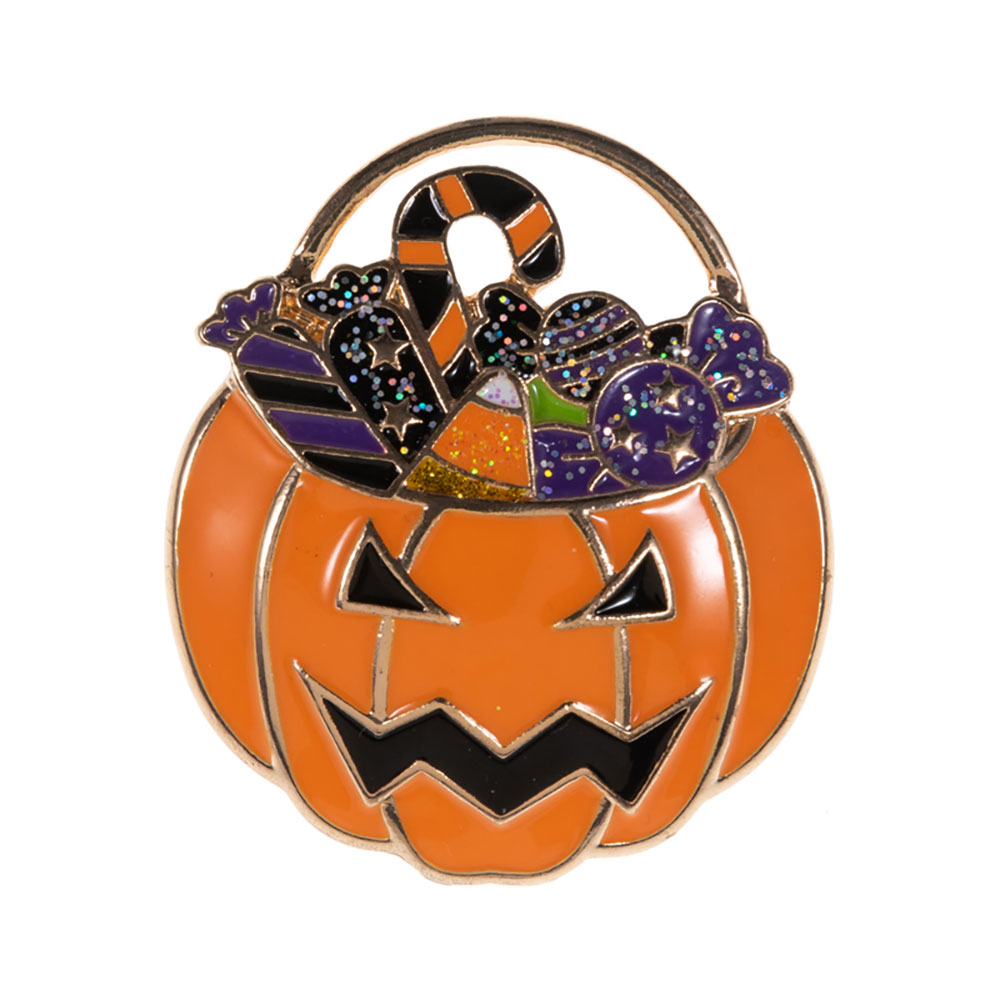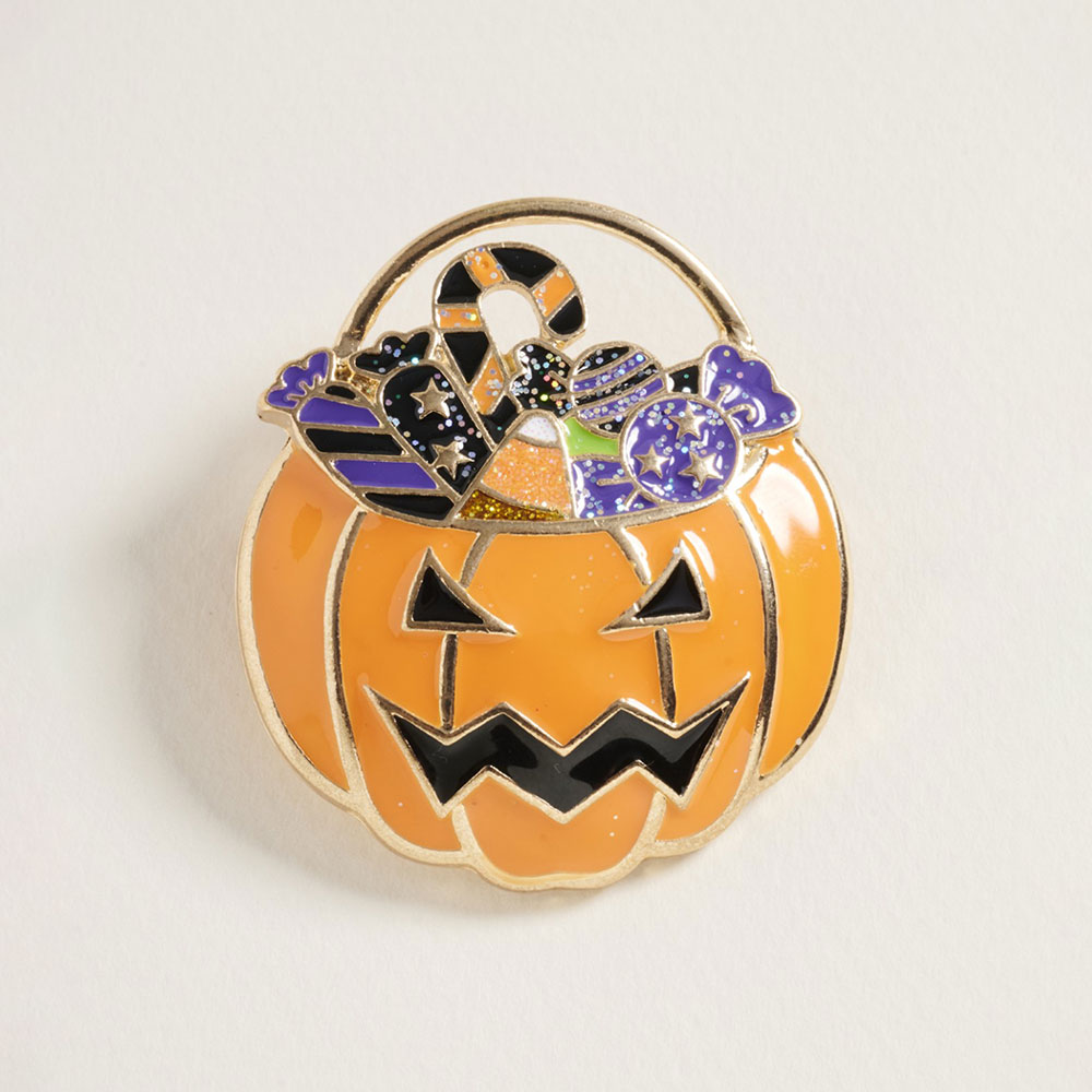 Details • Size : 1.75" X 2" • Pin Brooch • Add festive flair to your Halloween outfit with this playful jack-o'-lantern brooch, filled with colorful candy details. A charming accessory perfect for spooky season celebrations. • Lead and Nickel Compliant