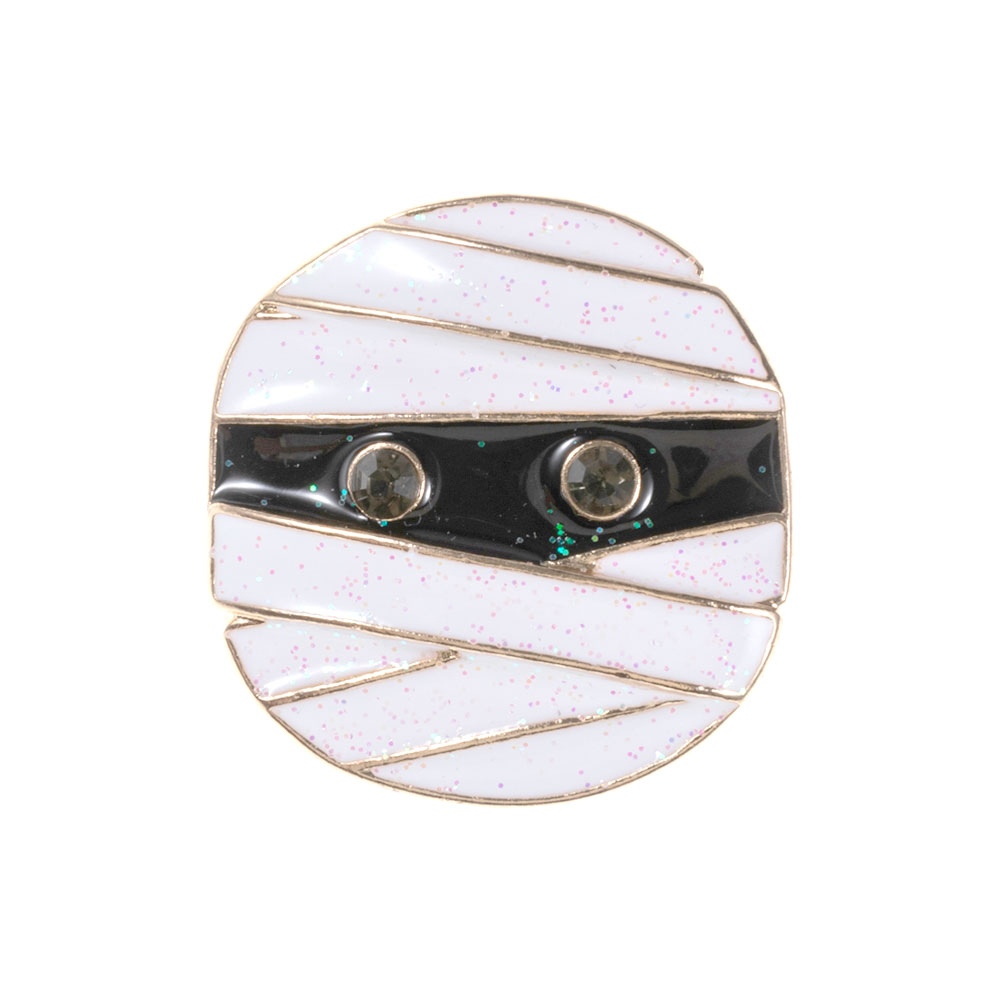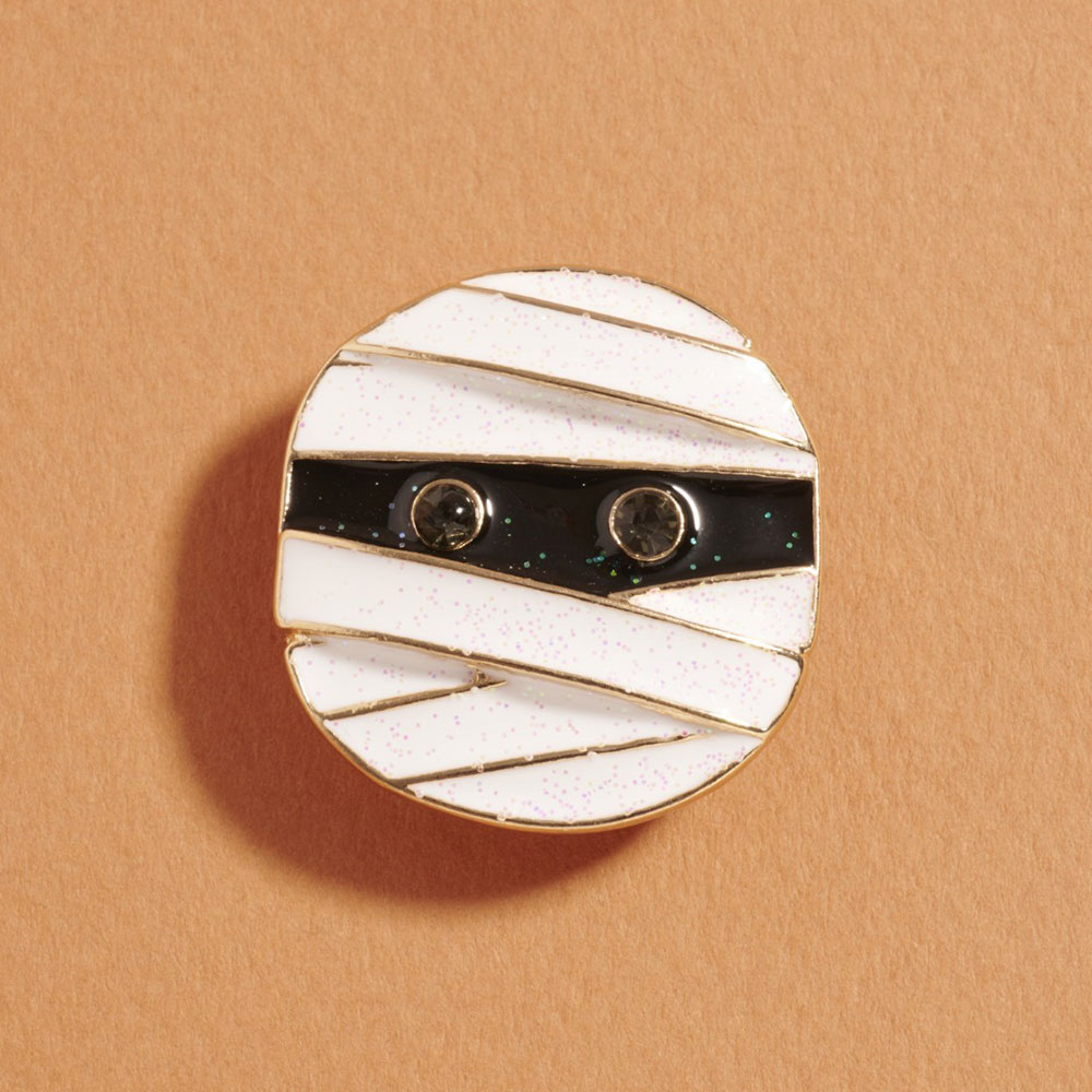 Details • Size : 1.25" X 1.25" • Pin Brooch • This playful round mummy pin features a wrapped design with peek-through eyes, adding a spooky-cute accent to your Halloween outfit. Perfect for decorating jackets, hats, or bags during festive celebrations. • Lead and Nickel Compliant