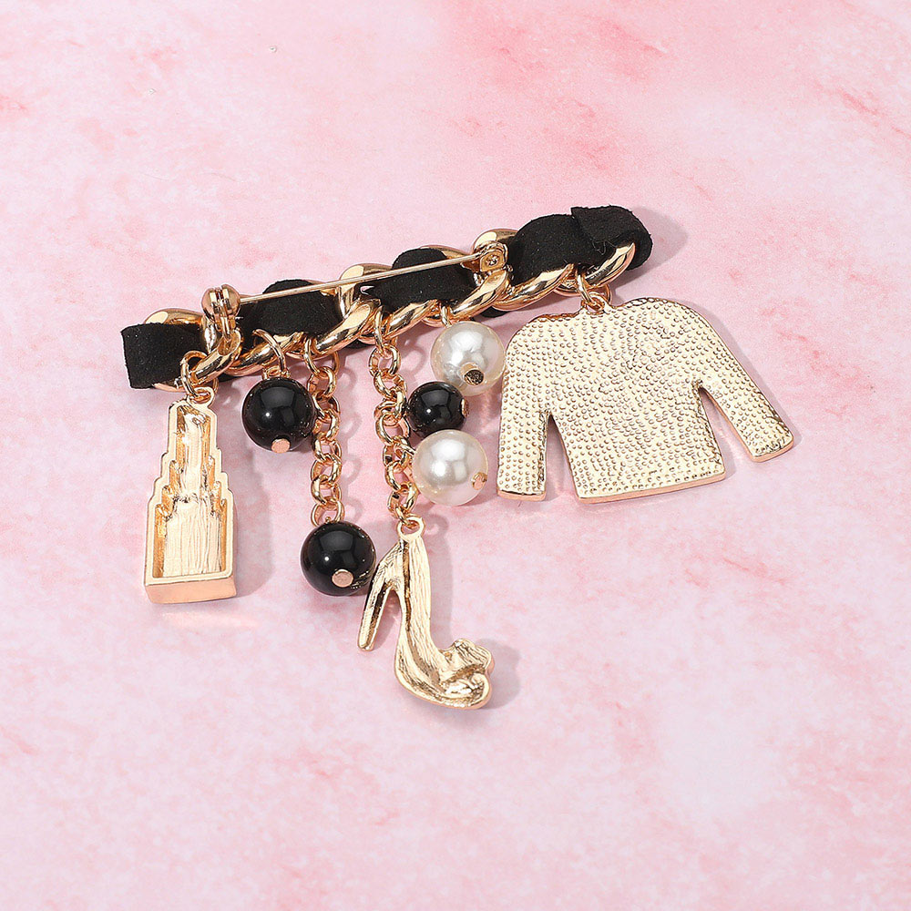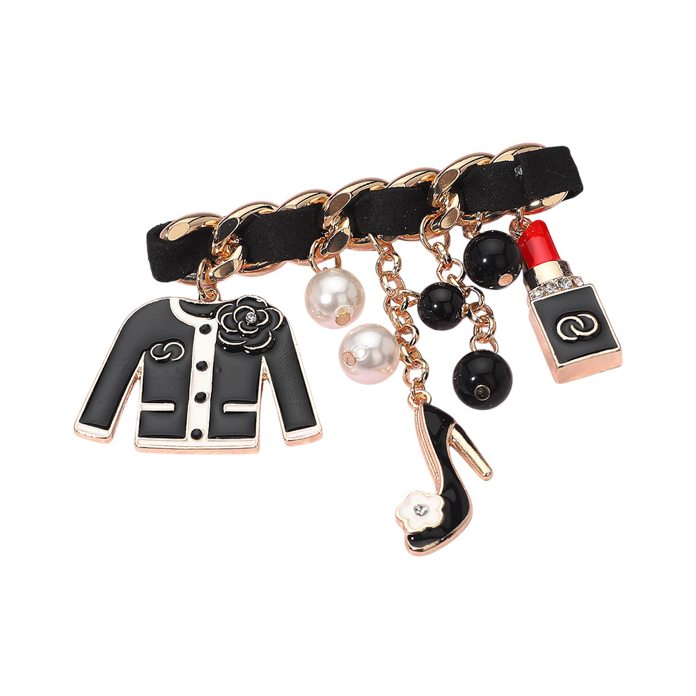 • Chic fashion charm brooch featuring a mix of playful miniature pendants including a jacket, lipstick, and heel, accented with beaded details. A trendy statement accessory that adds personality and couture-inspired flair to jackets, bags, or scarves.