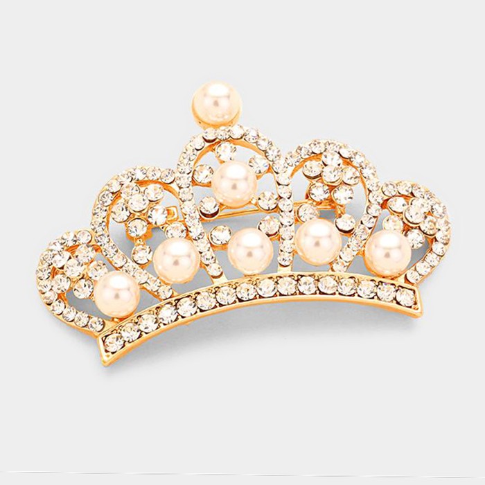 Pearl Pointed Stone Paved Crown Pin Brooch