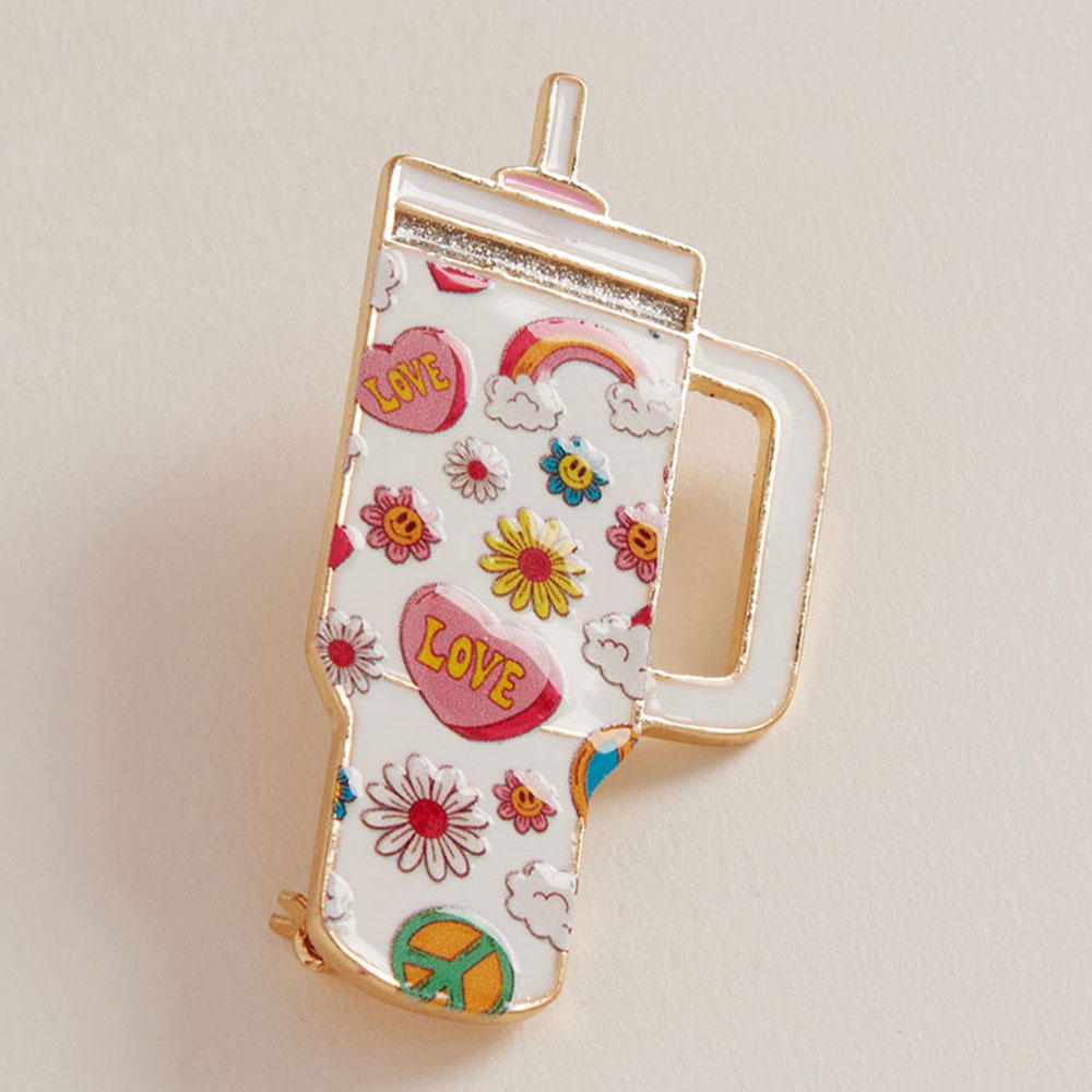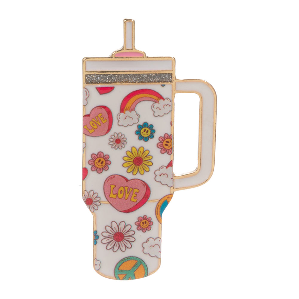 Details • Size : 1.2" X 2.3" • Pin Brooch • Add a pop of positivity to your look with this enamel pin featuring retro motifs like rainbows, flowers, and peace signs. A cheerful drink tumbler shape that brings vibrant vibes to any bag, hat, or jacket. • Lead and Nickel Compliant