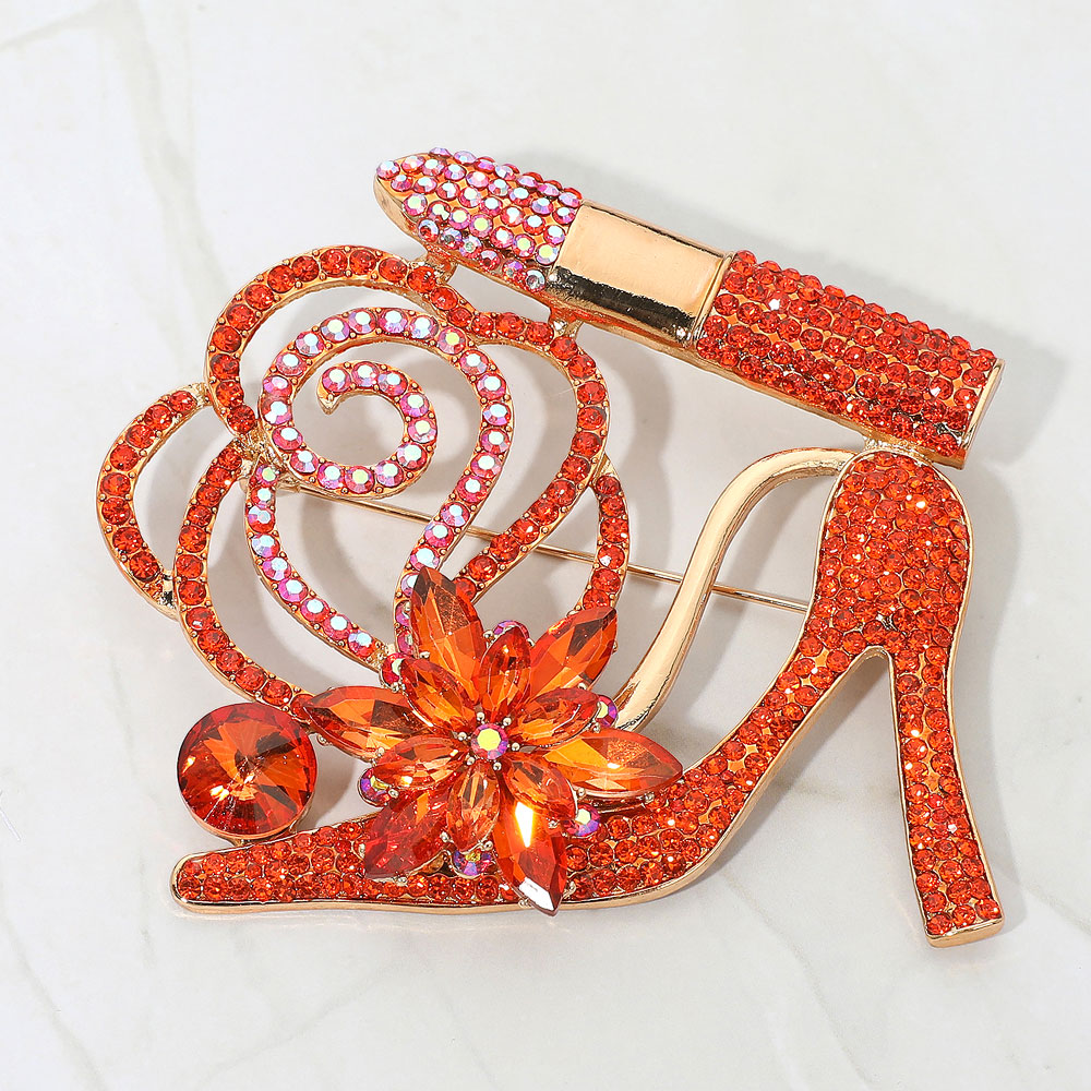 • Glamorous brooch featuring a high heel, lipstick, floral accents, and sparkling crystals. A bold statement accessory perfect for adding flair to jackets, scarves, or bags. Ideal for special occasions or gifting with a touch of fashion-forward fun.