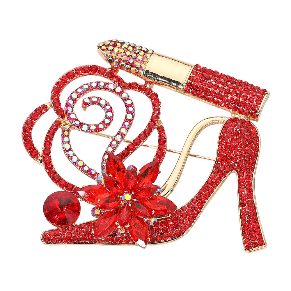 Rhinestone Embellished Flower Accent Glam High Heel Lipstick Pin Brooch