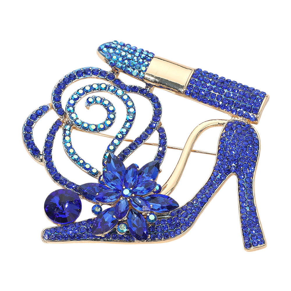 Details • Size : 3.2" X 3.5" • Pin Brooch • Glamorous brooch featuring a high heel, lipstick, floral accents, and sparkling crystals. A bold statement accessory perfect for adding flair to jackets, scarves, or bags. Ideal for special occasions or gifting with a touch of fashion-forward fun. • Lead and Nickel Compliant