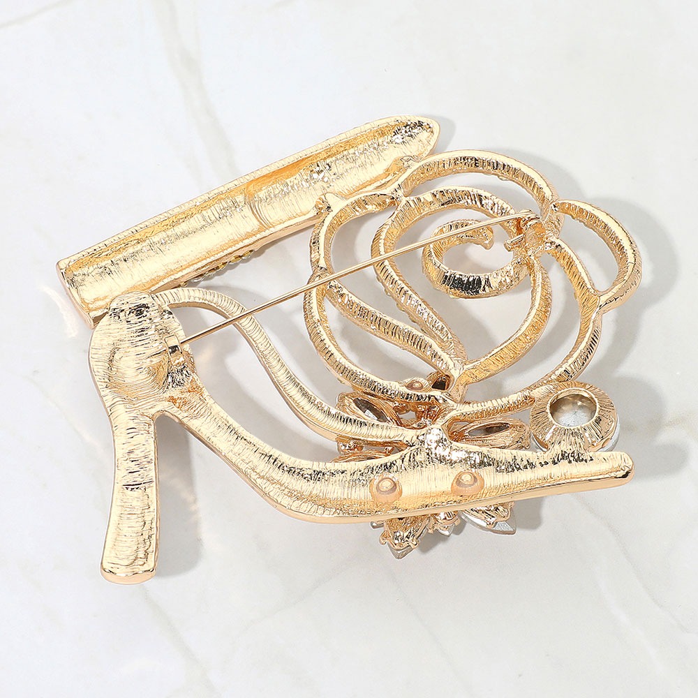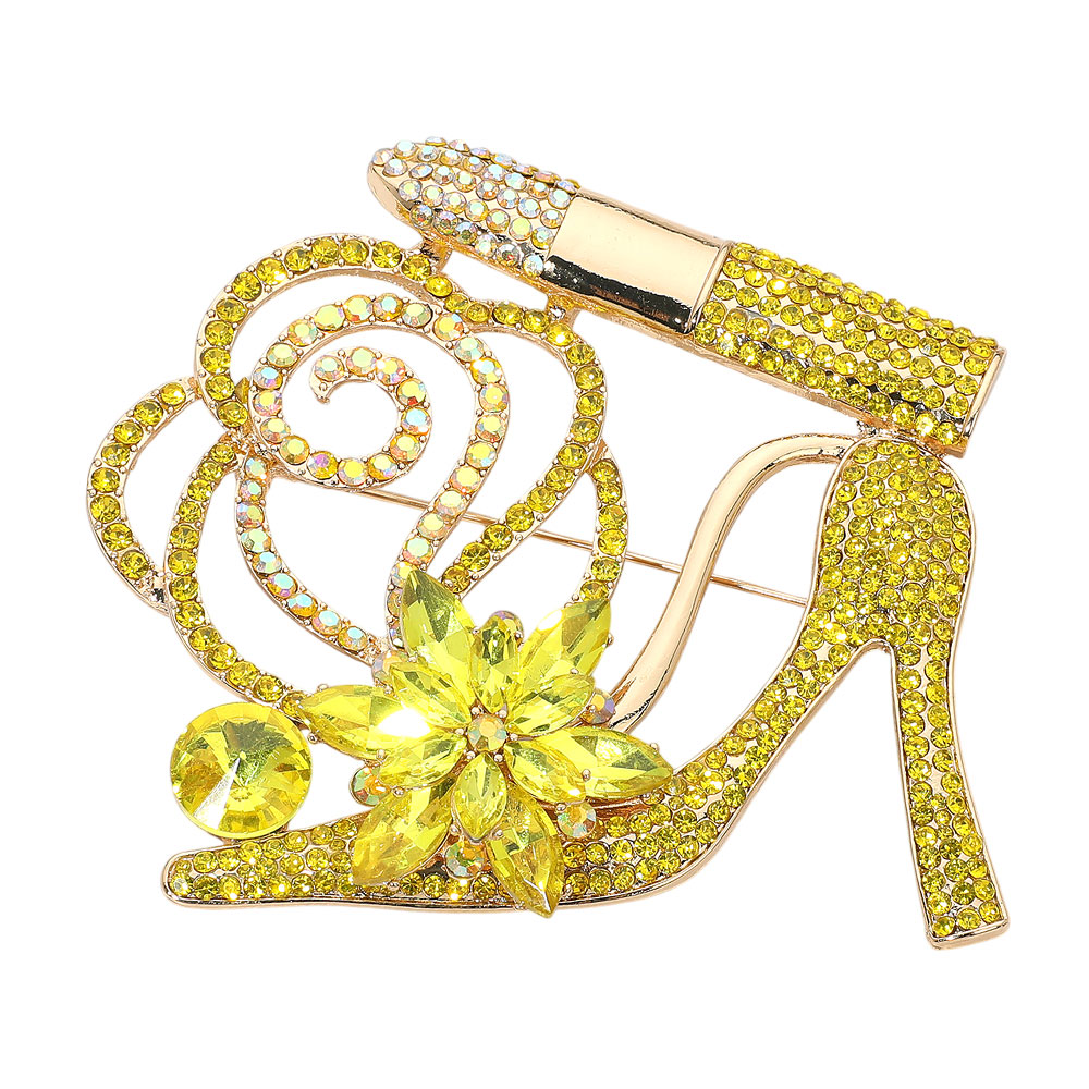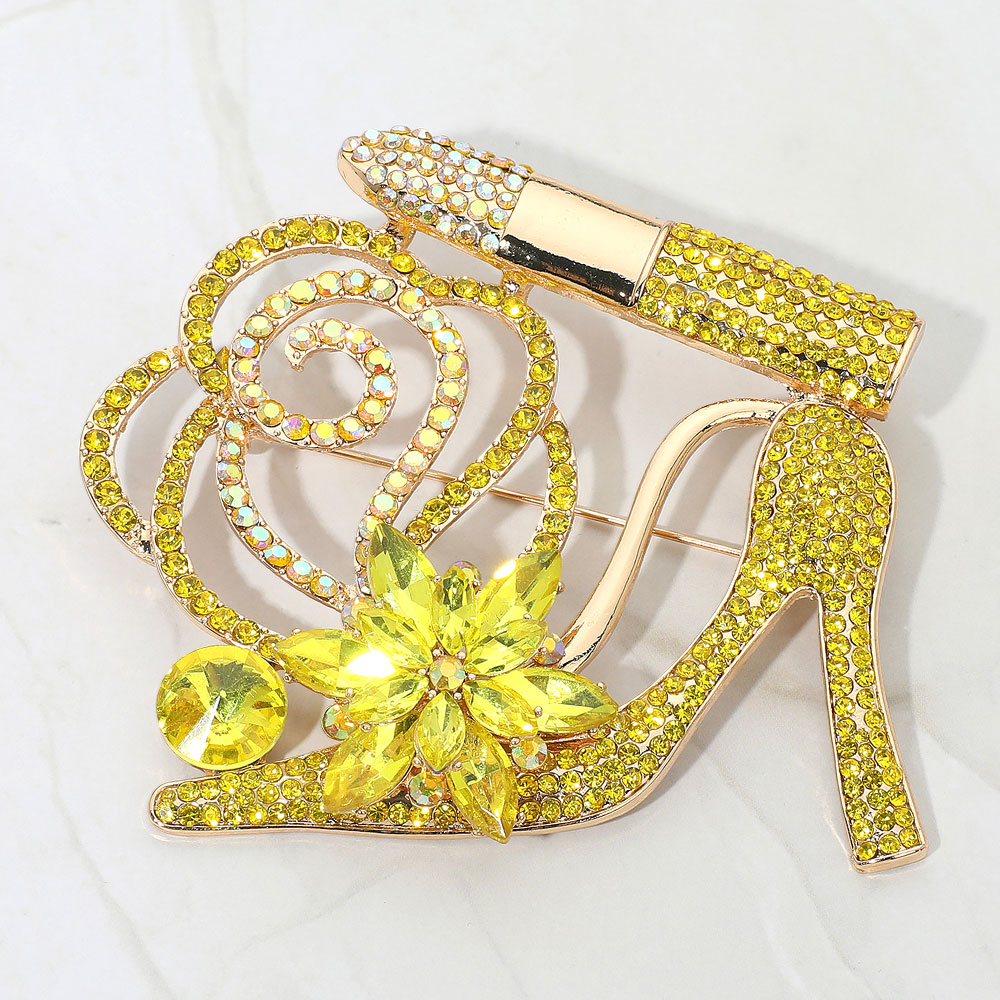 • Glamorous brooch featuring a high heel, lipstick, floral accents, and sparkling crystals. A bold statement accessory perfect for adding flair to jackets, scarves, or bags. Ideal for special occasions or gifting with a touch of fashion-forward fun.