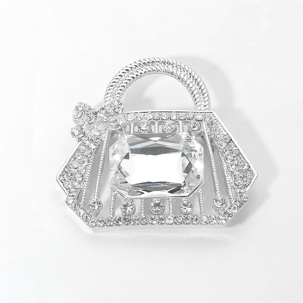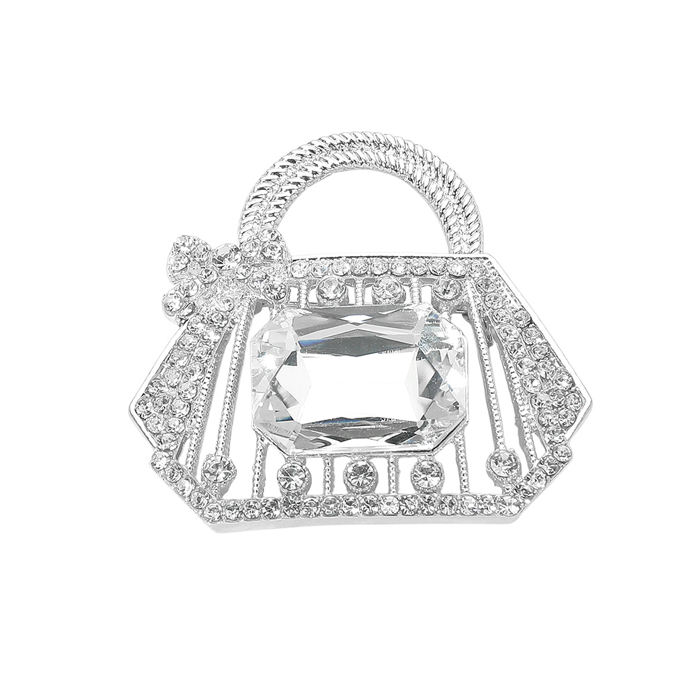 Details • Size : 2.1" X 2" • Pin Brooch • Elevate your style with this handbag-shaped brooch, featuring a large faceted crystal centerpiece, bow detail, and shimmering stones. A chic accessory for fashion lovers, it adds sparkle and charm to outfits for everyday or special occasions. • Lead and Nickel Compliant