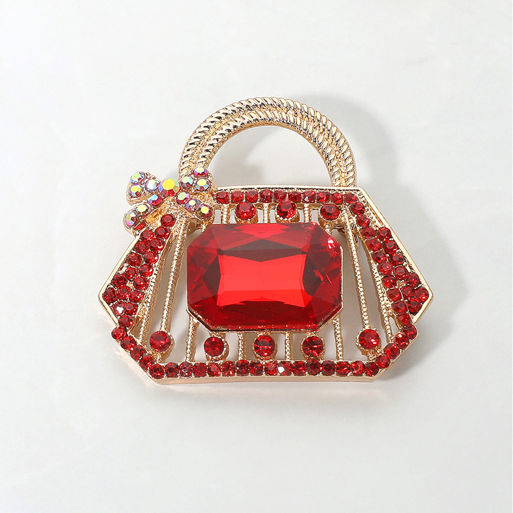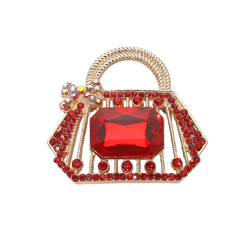 Details • Size : 2.1" X 2" • Pin Brooch • Elevate your style with this handbag-shaped brooch, featuring a large faceted crystal centerpiece, bow detail, and shimmering stones. A chic accessory for fashion lovers, it adds sparkle and charm to outfits for everyday or special occasions. • Lead and Nickel Compliant