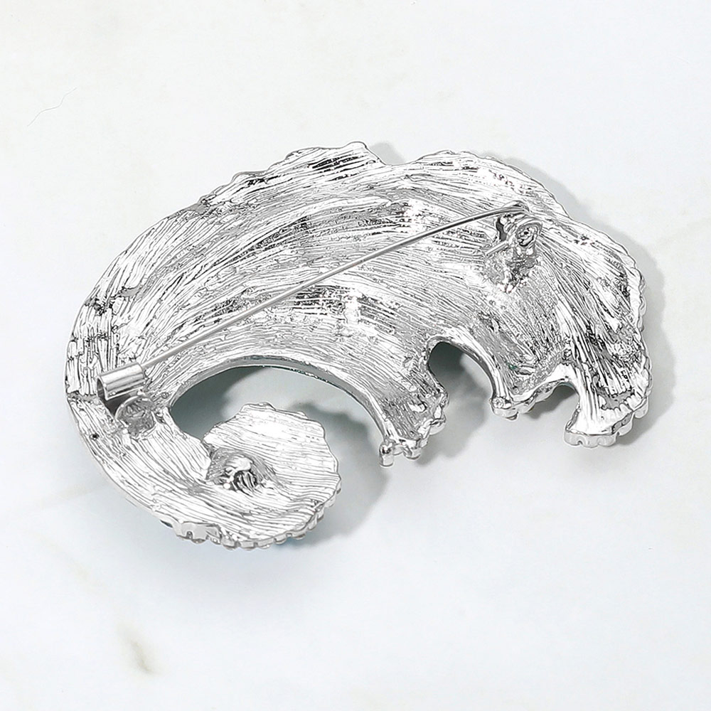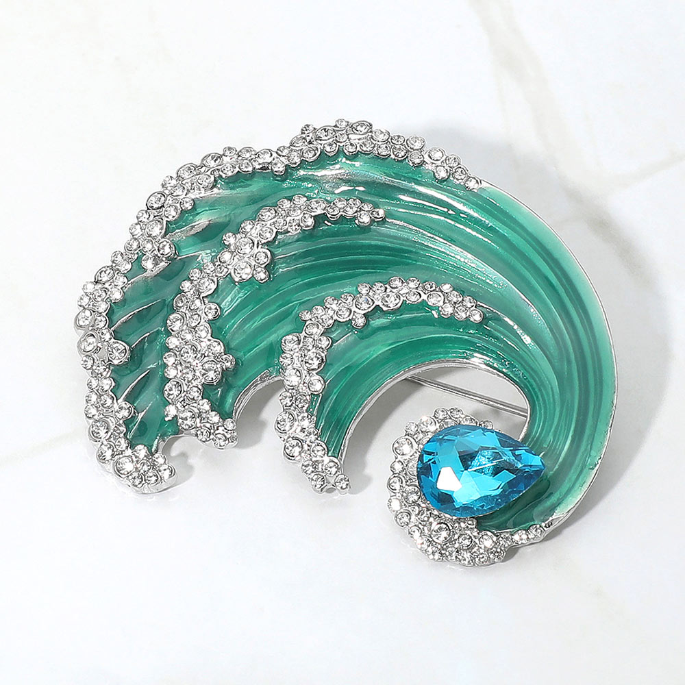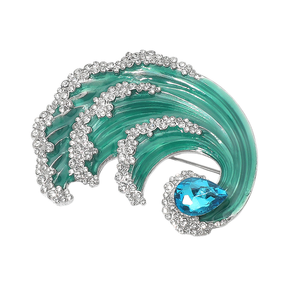 Details • Size : 2.5" X 2" • Pin Brooch • Make a bold statement with this ocean wave brooch, designed with elegant curves, dazzling rhinestones, and a striking gem accent. Perfect for sea lovers and beach-themed outfits, this eye-catching accessory brings fluid motion and coastal charm to any look. • Lead and Nickel Compliant