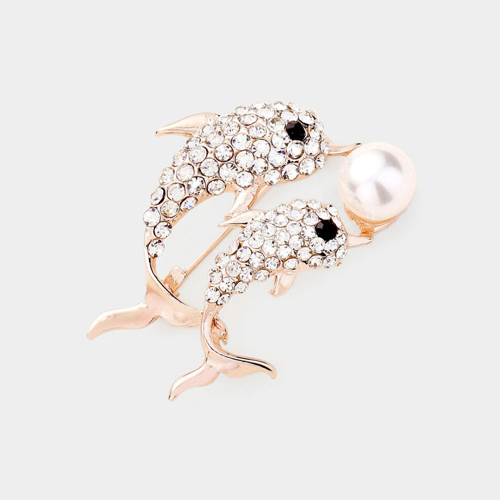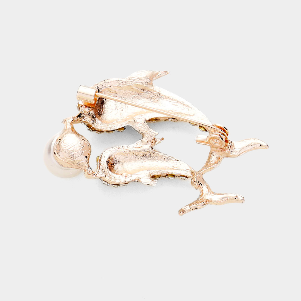 Rhinestone Pave Pearl Dolphin Pin Brooch