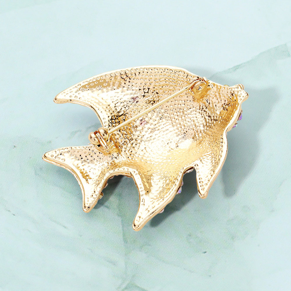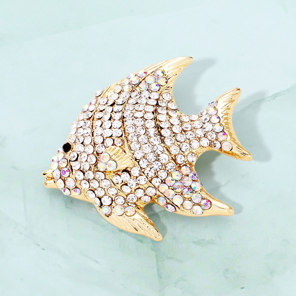 • Vibrant fish brooch adorned with sparkling rhinestones in a playful aquatic design. Perfect for adding a lively marine-themed accent to jackets, blouses, or bags with whimsical charm.