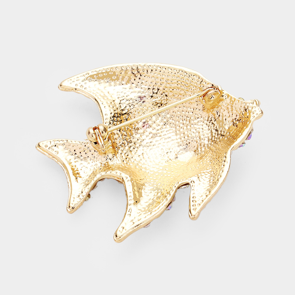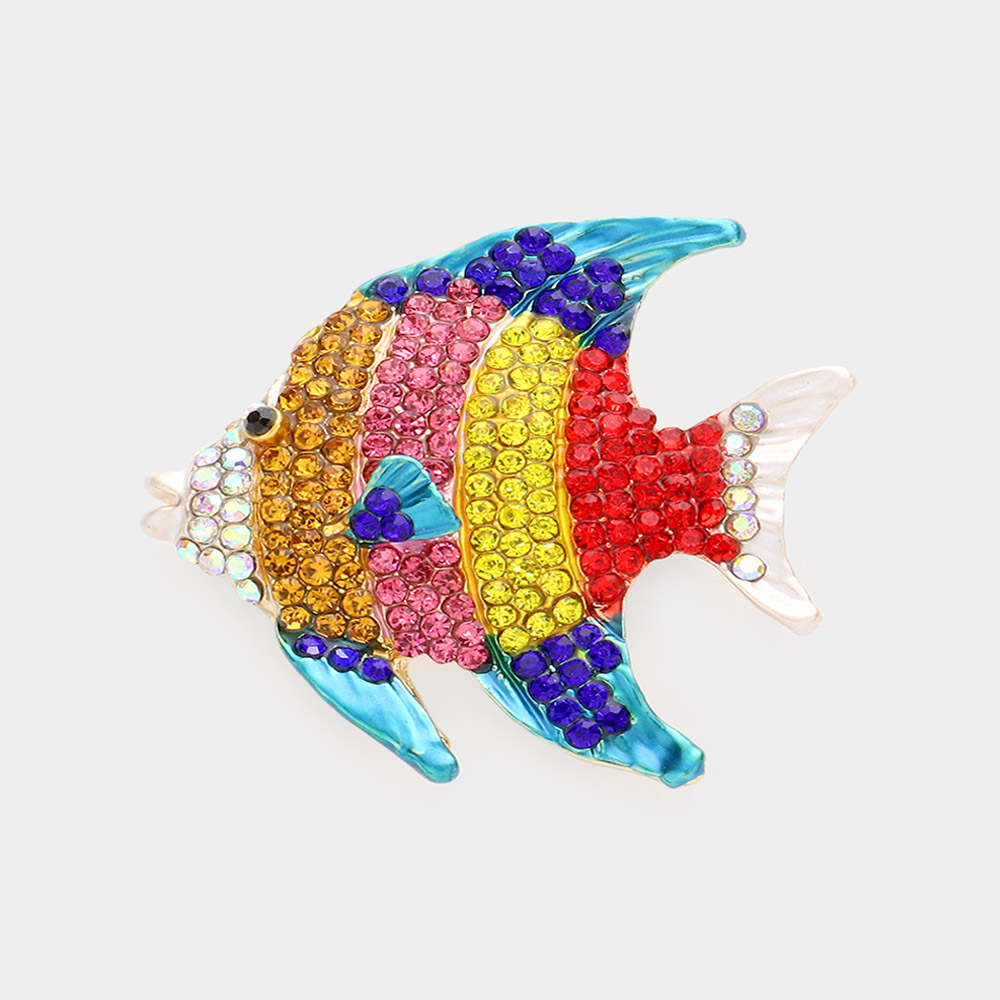 • Vibrant fish brooch adorned with sparkling rhinestones in a playful aquatic design. Perfect for adding a lively marine-themed accent to jackets, blouses, or bags with whimsical charm.