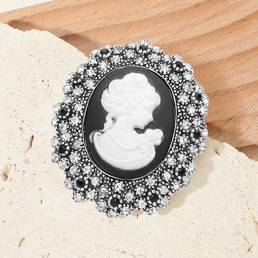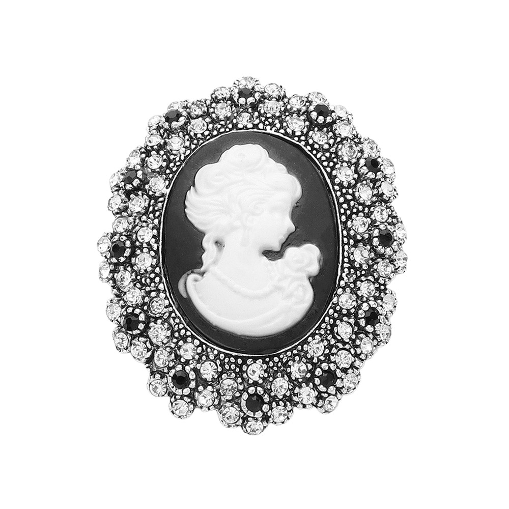 Details • Size : 1.6" X 1.8" • Pin Brooch • Timeless and elegant, this cameo brooch features a classic silhouette surrounded by vibrant decorative gems. A perfect statement piece for lovers of vintage fashion, it adds charm to lapels, scarves, or bags with its intricate and nostalgic design. • Lead and Nickel Compliant