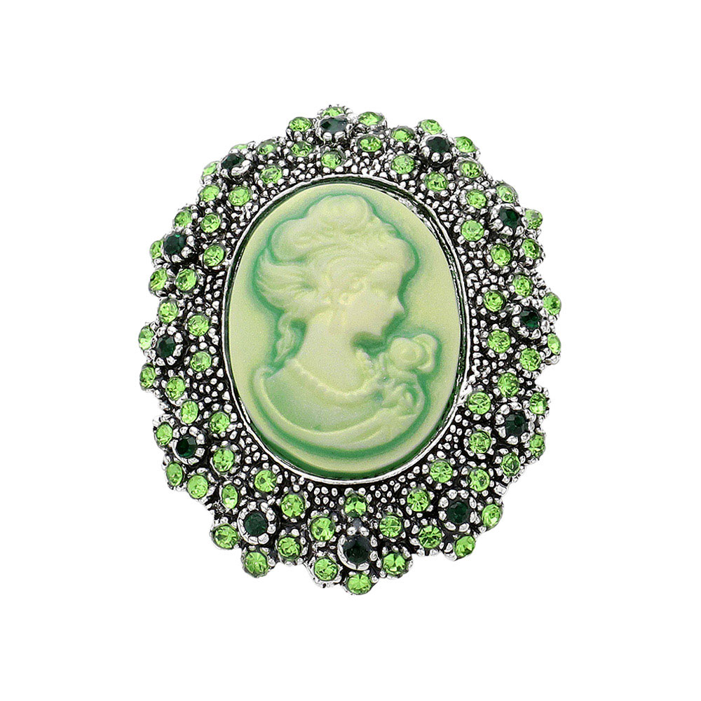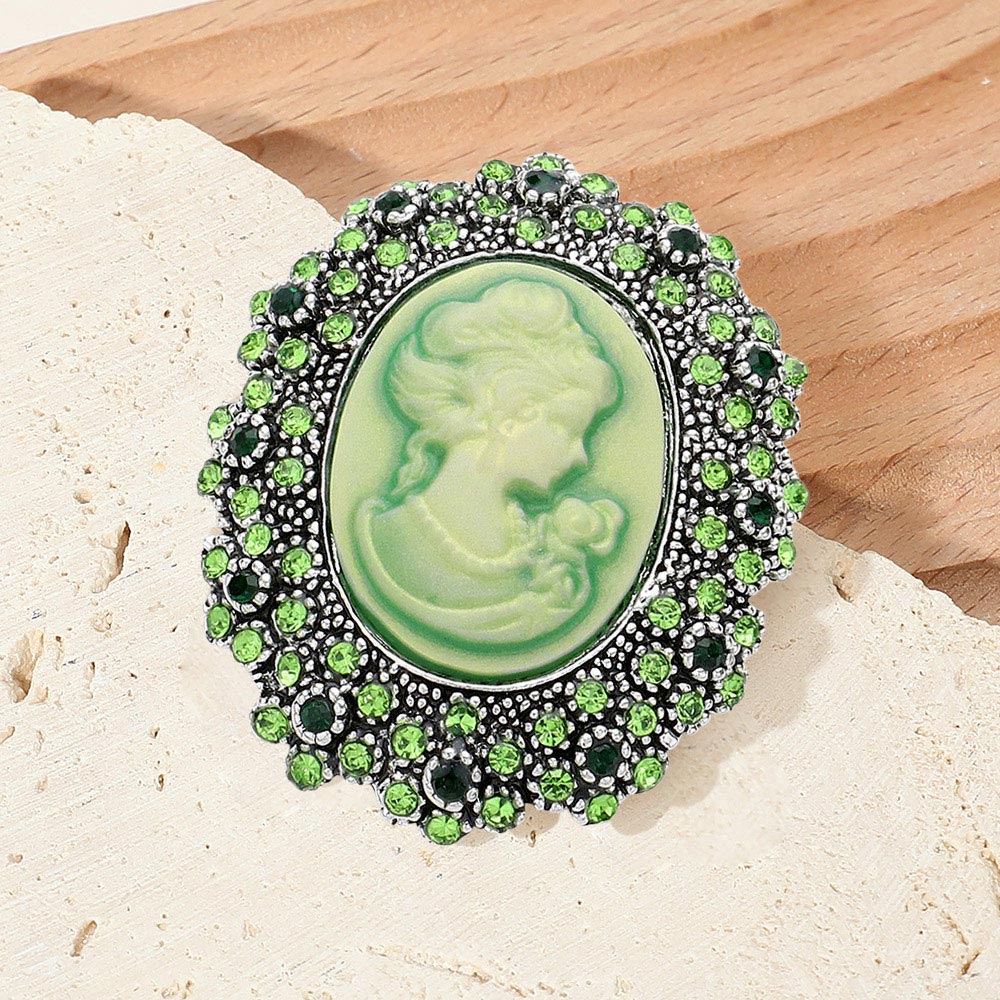 Details • Size : 1.6" X 1.8" • Pin Brooch • Timeless and elegant, this cameo brooch features a classic silhouette surrounded by vibrant decorative gems. A perfect statement piece for lovers of vintage fashion, it adds charm to lapels, scarves, or bags with its intricate and nostalgic design. • Lead and Nickel Compliant