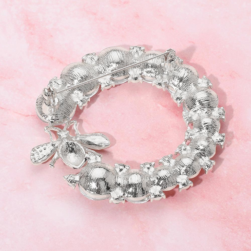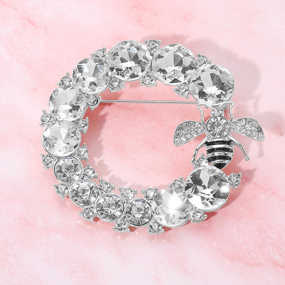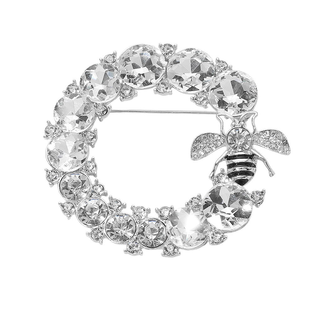 Details • Size : 2.75" X 2.6" • Pin Brooch • Elegant circular brooch adorned with large faceted crystals and a charming bee detail encrusted with shimmering stones. A statement accessory that adds whimsical elegance to jackets, scarves, or dresses, perfect for enhancing both casual and formal ensembles. • Lead and Nickel Compliant