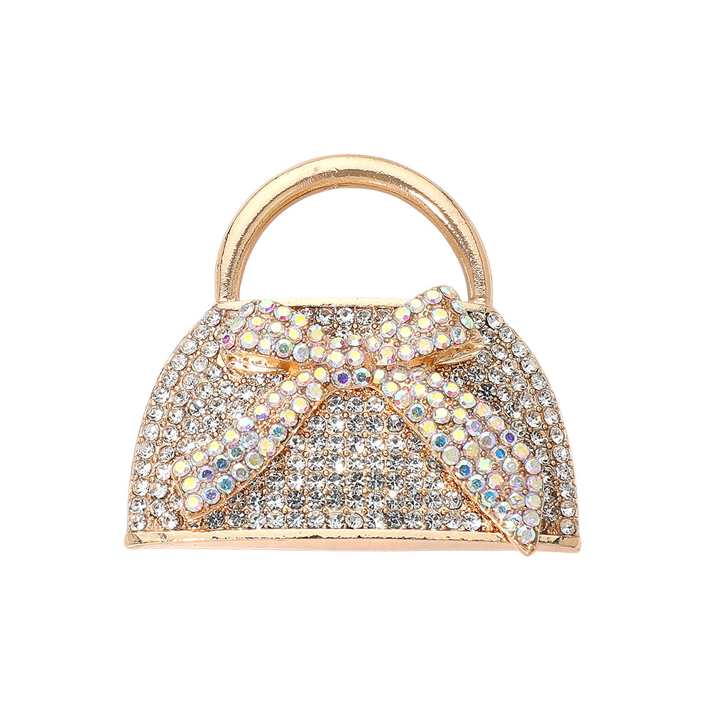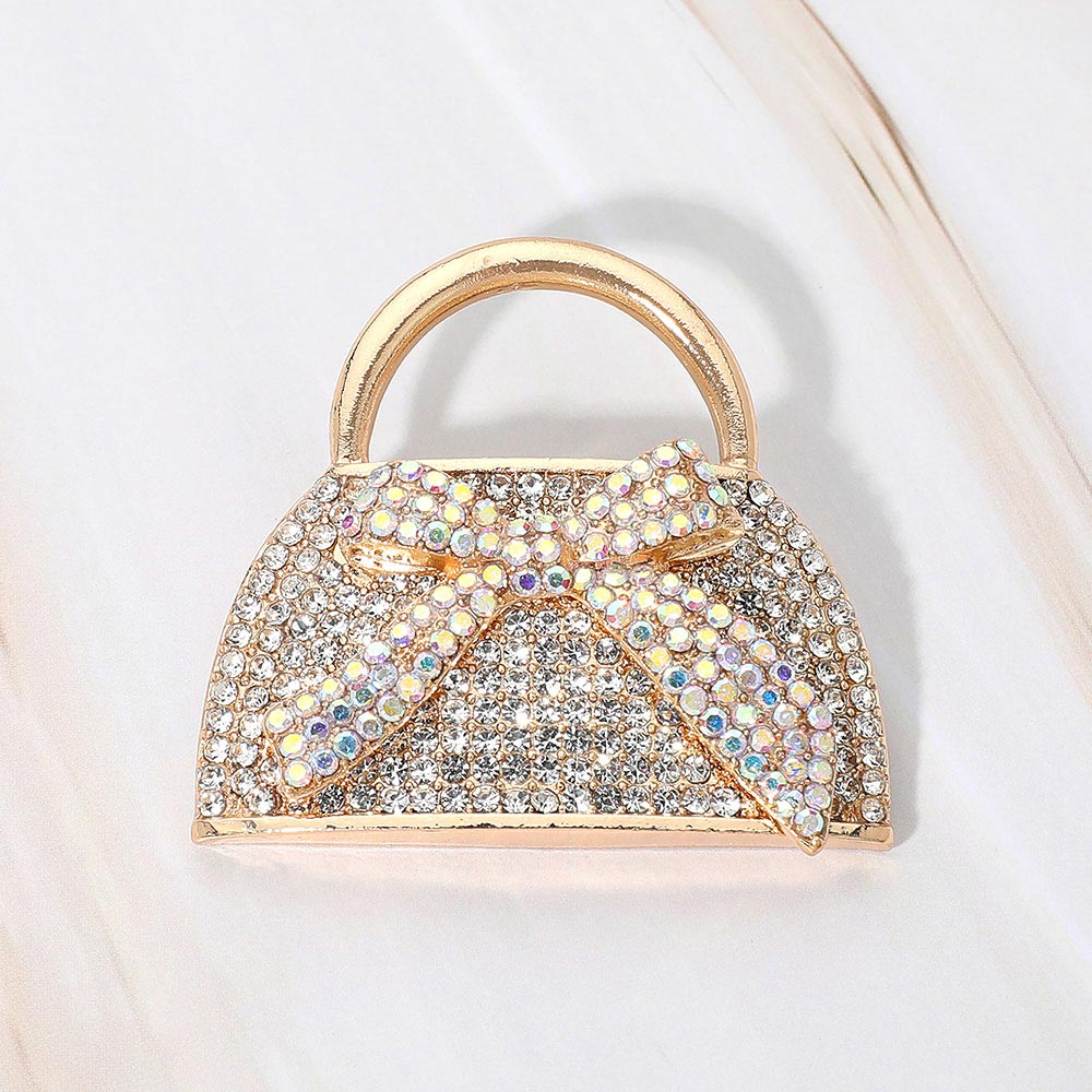 • This brooch features a sparkling handbag silhouette accented with a radiant bow, offering a refined touch of glamour. Its shimmering finish creates an elegant statement, making it an ideal accessory for enhancing both everyday looks and special occasion outfits.