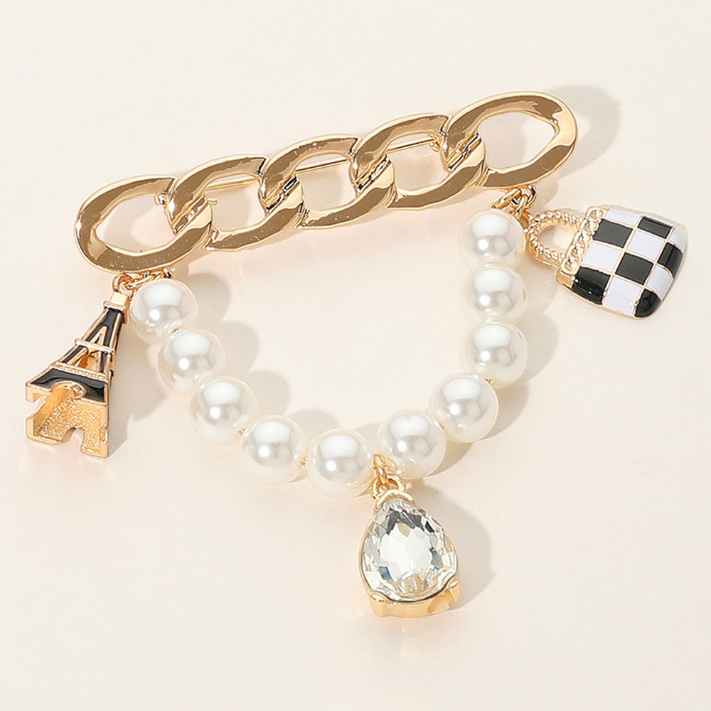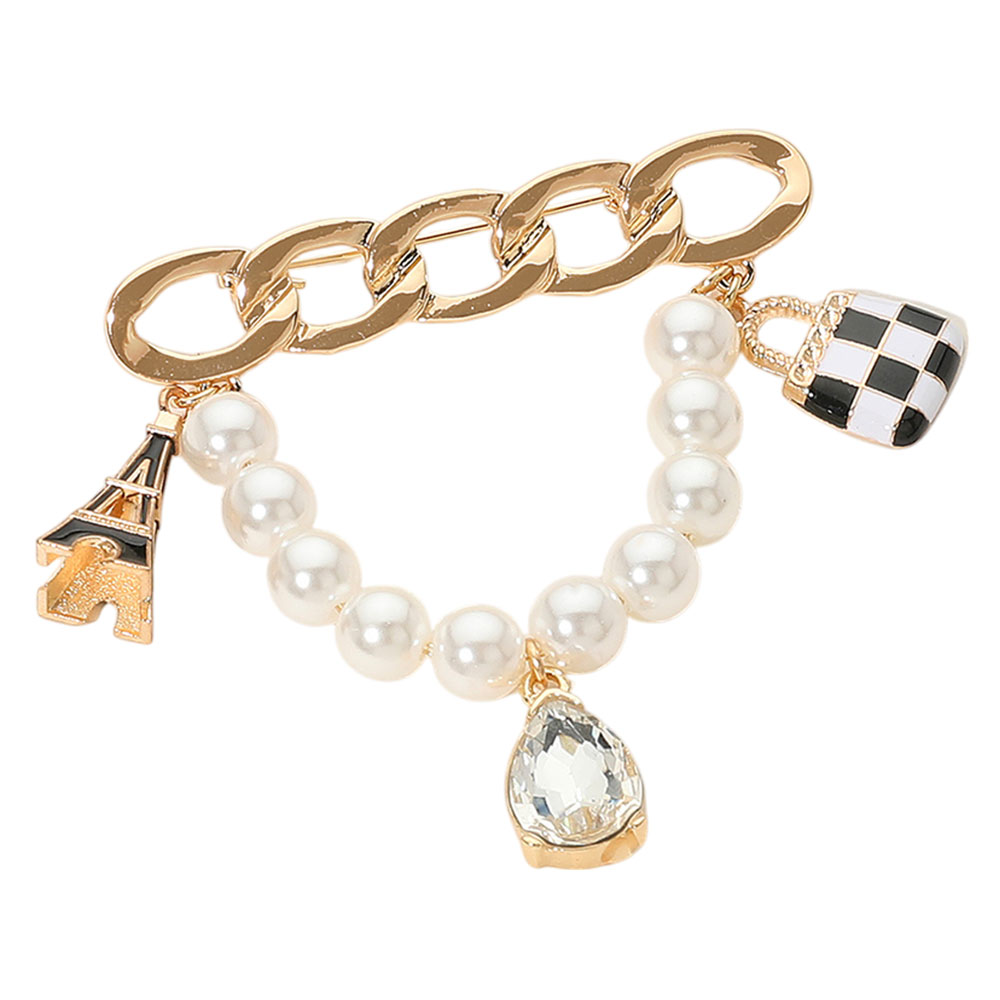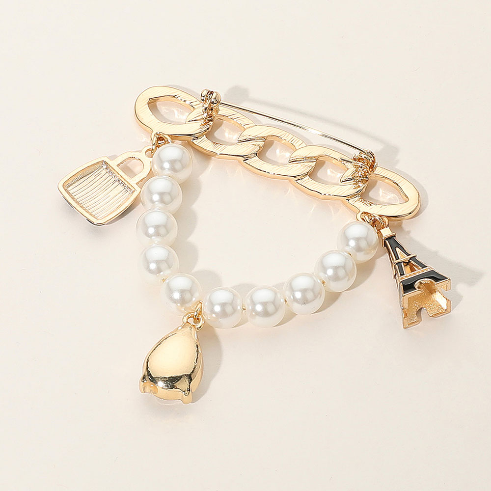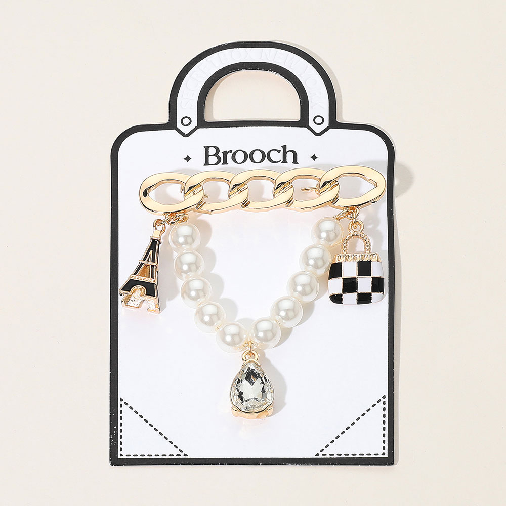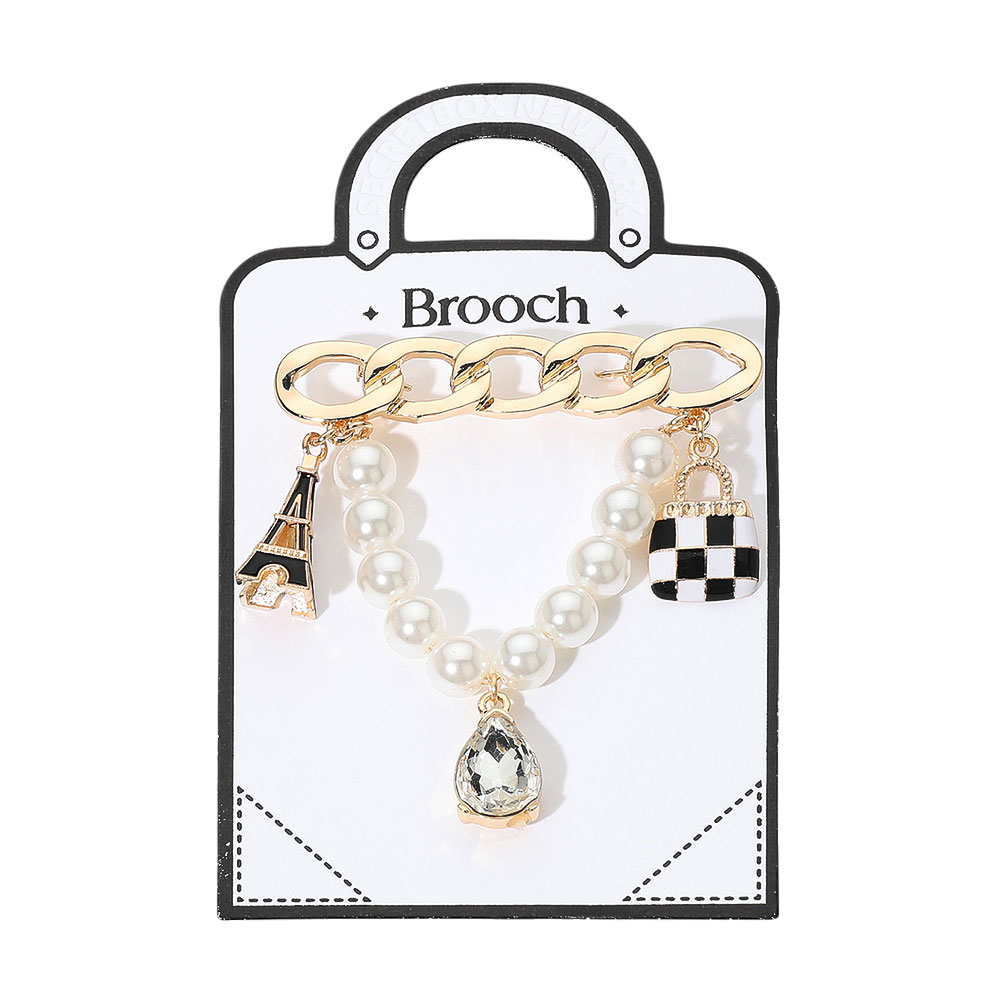 Details • Size : 2.4" X 2.7" • Pin Brooch • Add a touch of chic elegance with this stylish chain brooch, featuring pearl accents and playful charms for a fashionable finish. Perfect for enhancing casual or formal outfits, this versatile accessory makes a unique statement piece and a thoughtful gift for jewelry enthusiasts.