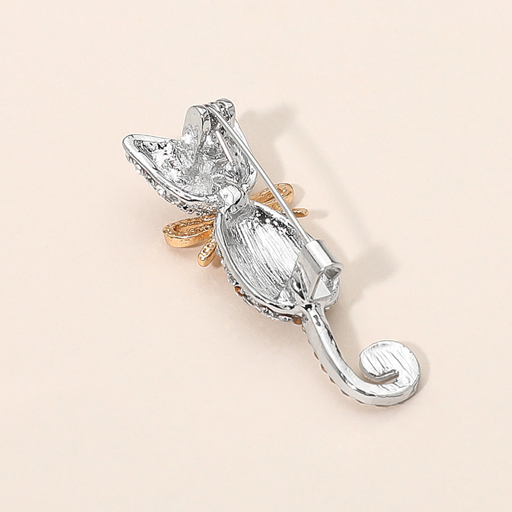 Details • Size : 0.6" X 1.6" • Pin Brooch • Chic cat brooch decorated with shimmering crystals and finished with a delicate bow accent. A playful yet stylish accessory that adds sparkle to jackets, scarves, or bags. Perfect gift choice for animal lovers, collectors, or anyone seeking a touch of whimsical charm in their look. • Lead and Nickel Compliant • Sterling Silver Dipped