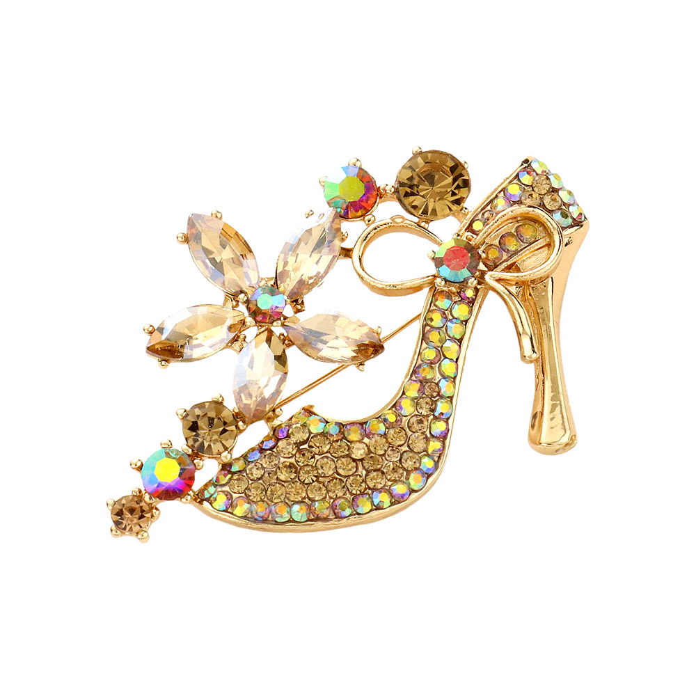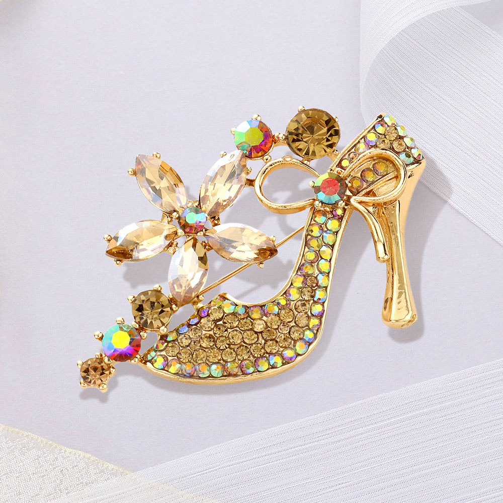 • Show off your love for style with this dazzling high heel shoe brooch, adorned with sparkling crystal accents and a floral design. A chic and playful accessory, this statement pin adds glamour to any outfit and makes a perfect gift for fashion lovers and trendsetters alike.