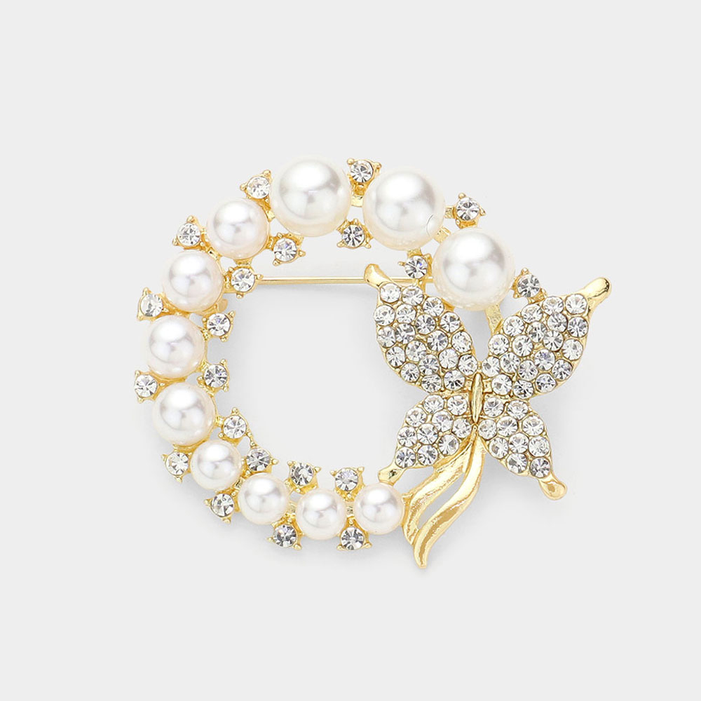 Stone Paved Butterfly Pearl Open Circle Pin Brooch