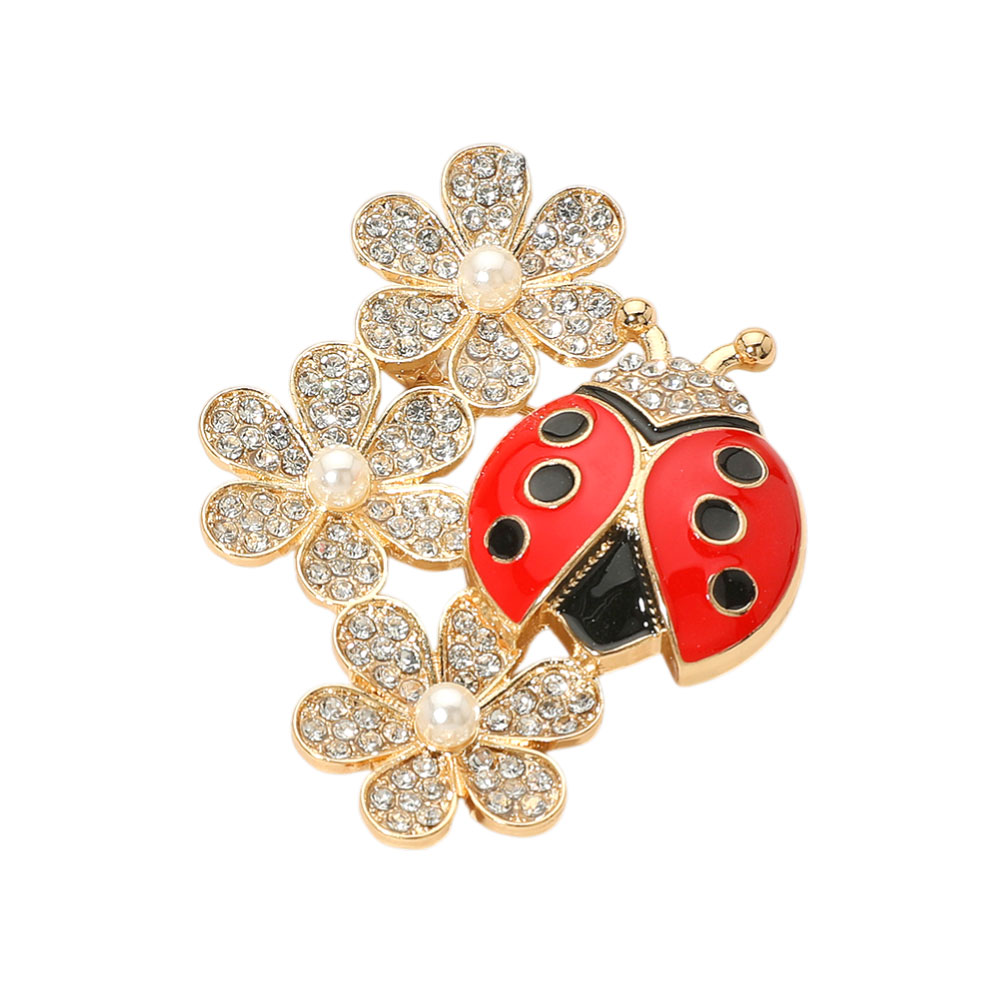 Details • Size : 1.8" X 2.4" • Pin Brooch • Add a playful yet elegant accent to your outfit with this ladybug brooch featuring sparkling crystal flowers. Its detailed design brings charm and personality to any jacket, bag, or scarf, making it a delightful accessory for casual or special occasions alike. • Lead and Nickel Compliant