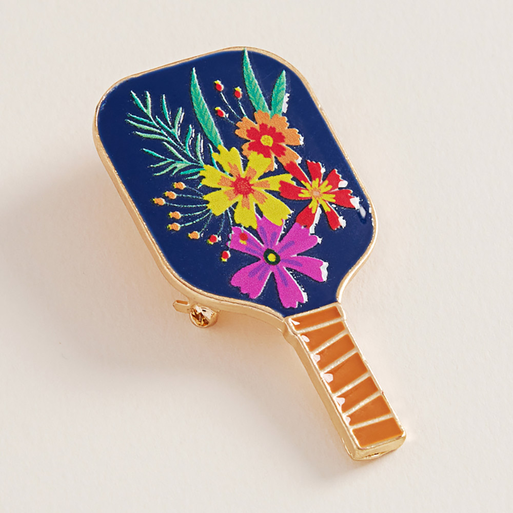 Tropical Floral Enamel Pickleball Paddle Pin Brooch