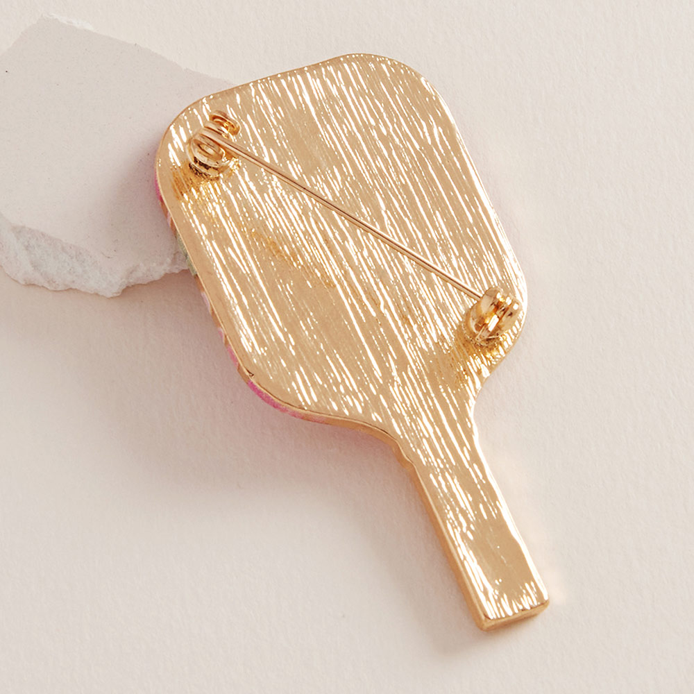• Elegant brooch shaped like a paddle, featuring a tropical floral motif. A playful and stylish accessory perfect for sports lovers and fashion enthusiasts alike.