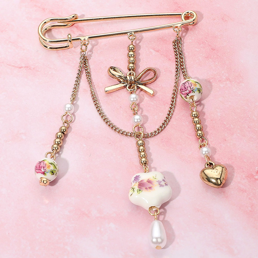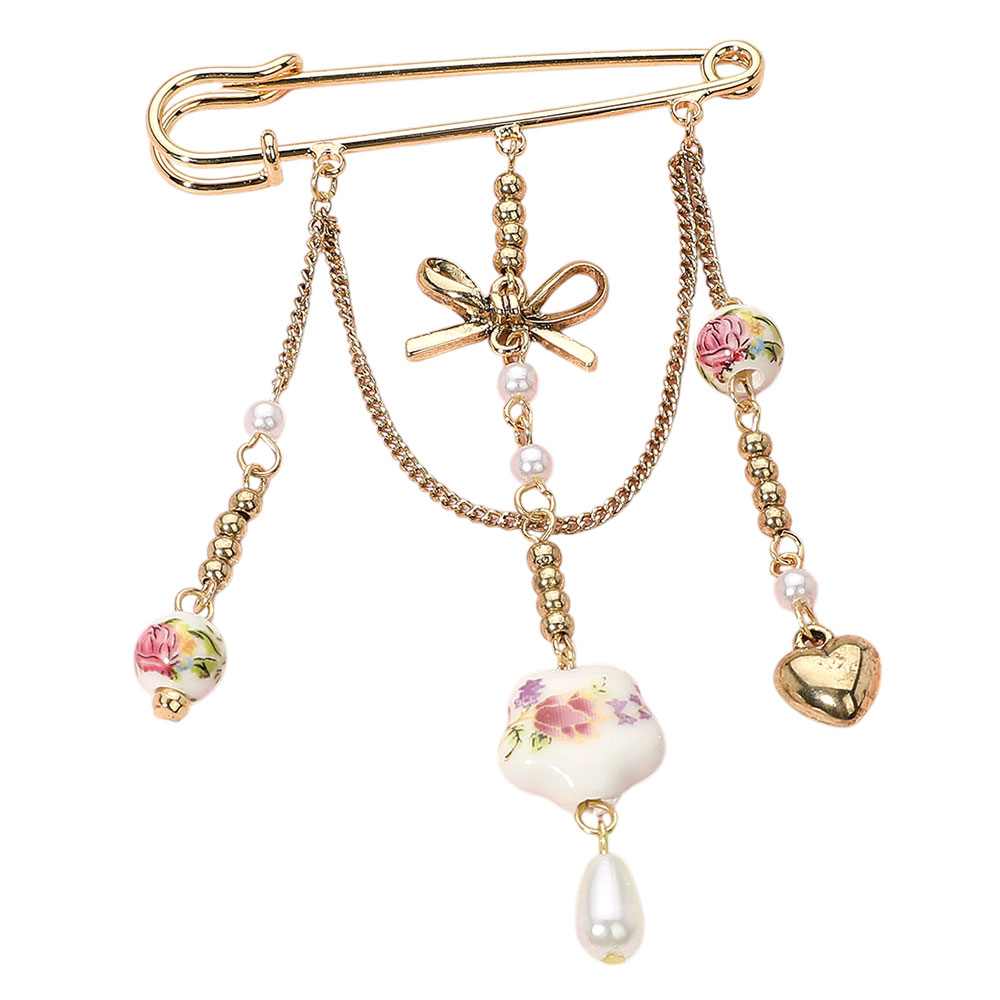 Vintage Inspired Floral Ceramic Ball Heart Pearl Bow Charm Dangle Accent Safety Pin Brooch
