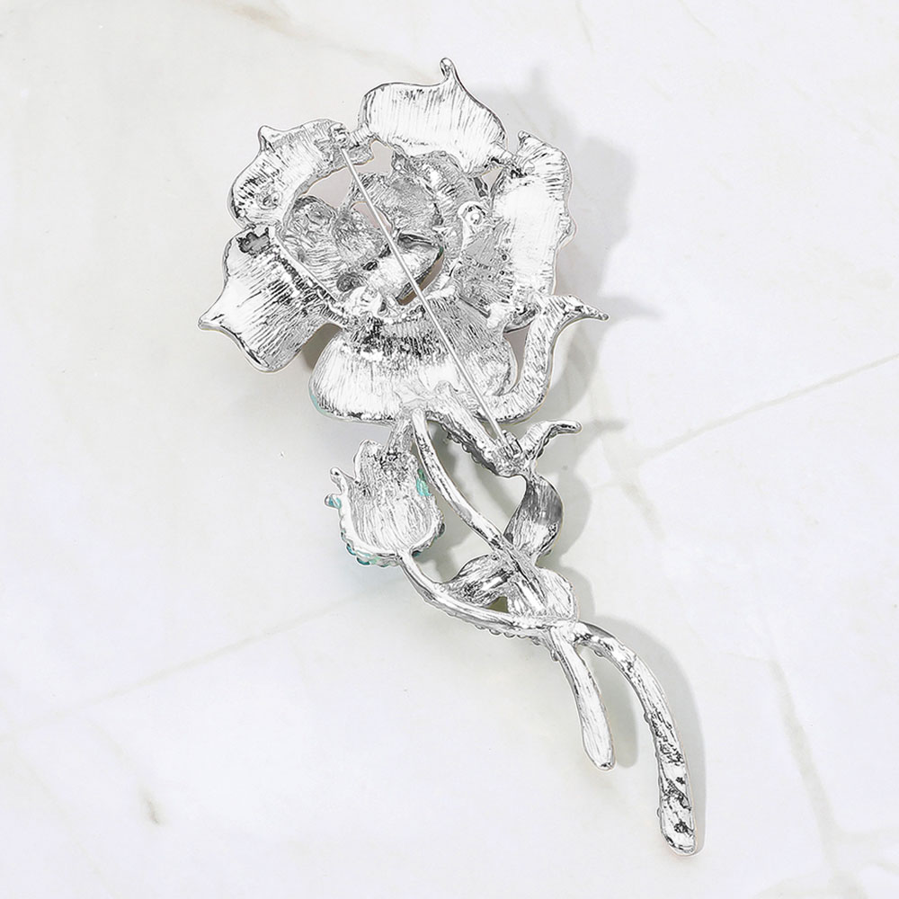 • Chic rhinestone rose brooch featuring a detailed floral silhouette with shimmering stones on the petals, stem, and leaves. Perfect for accessorizing jackets, dresses, scarves, or bags with a refined and eye-catching statement touch.