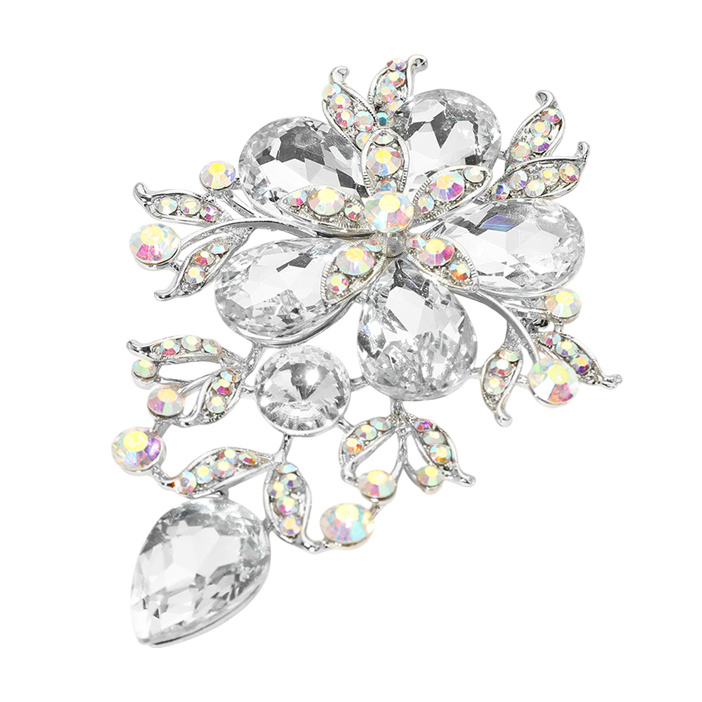 Details • Size : 3.6" X 4.8" • Pin Brooch • Glamorous rhinestone flower brooch featuring intricate floral design with sparkling accents. Perfect for elevating dresses, scarves, jackets, or evening wear. A bold statement piece that adds luxury and timeless charm, making it an ideal accessory for parties, weddings, or special events. • Lead and Nickel Compliant