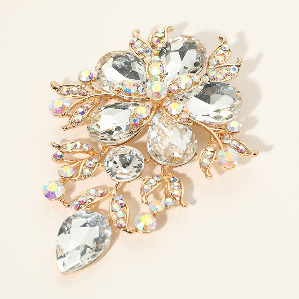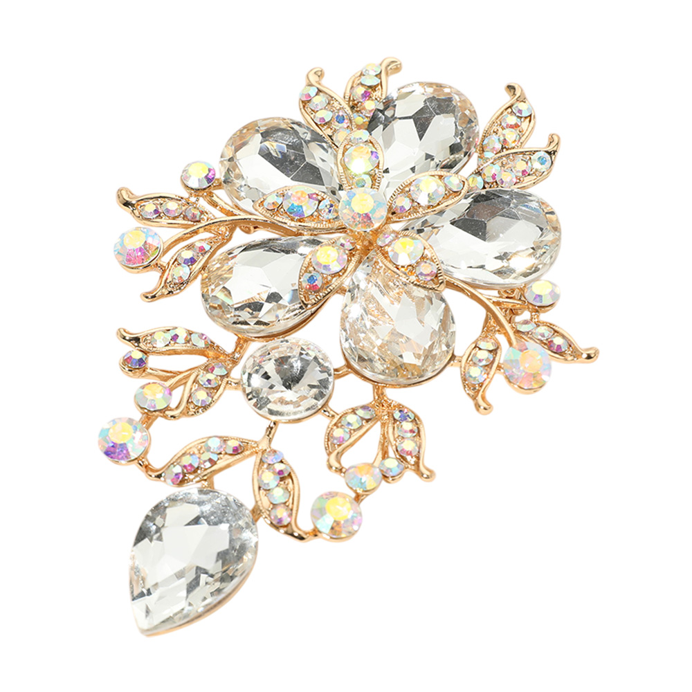 Details • Size : 3.6" X 4.8" • Pin Brooch • Glamorous rhinestone flower brooch featuring intricate floral design with sparkling accents. Perfect for elevating dresses, scarves, jackets, or evening wear. A bold statement piece that adds luxury and timeless charm, making it an ideal accessory for parties, weddings, or special events. • Lead and Nickel Compliant