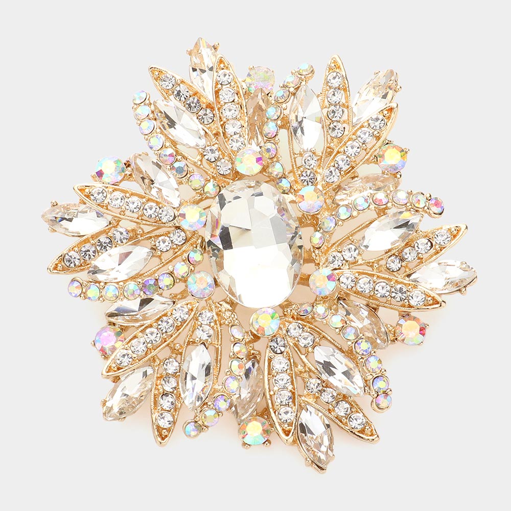 Flower Stone Cluster Pointed Glass Stone Embellished Leaf Pin Brooch