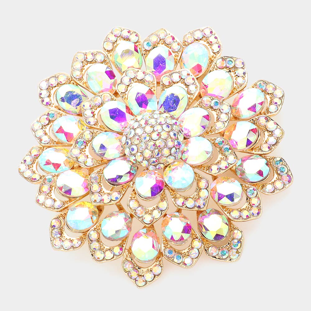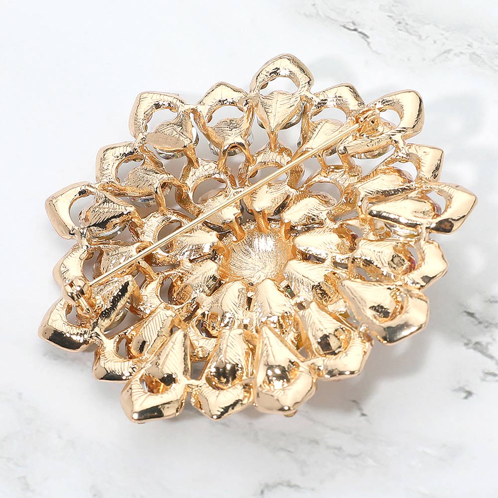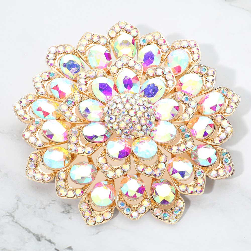 Details • Size : 3.1" X 3.1" • Pin Brooch • Stunning floral brooch designed with layered petals and iridescent crystal gemstones. Perfect as a statement accessory for dresses, scarves, shawls, or special occasions, adding sparkle and elegance to any outfit. • Lead and Nickel Compliant