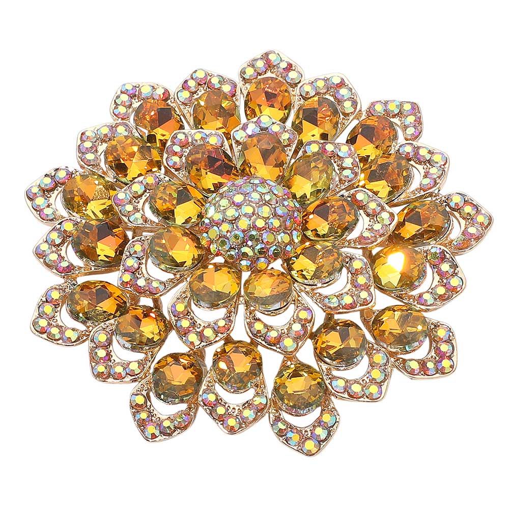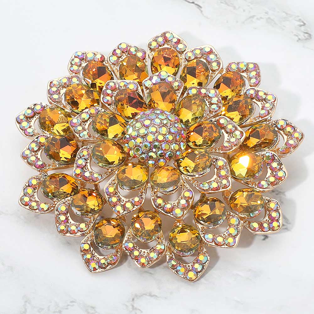 Details • Size : 3.1" X 3.1" • Pin Brooch • Stunning floral brooch designed with layered petals and iridescent crystal gemstones. Perfect as a statement accessory for dresses, scarves, shawls, or special occasions, adding sparkle and elegance to any outfit. • Lead and Nickel Compliant