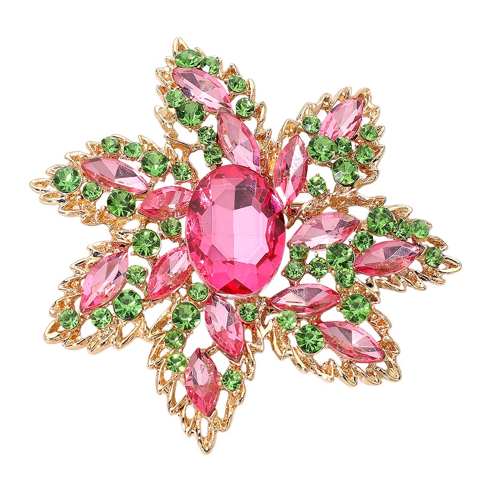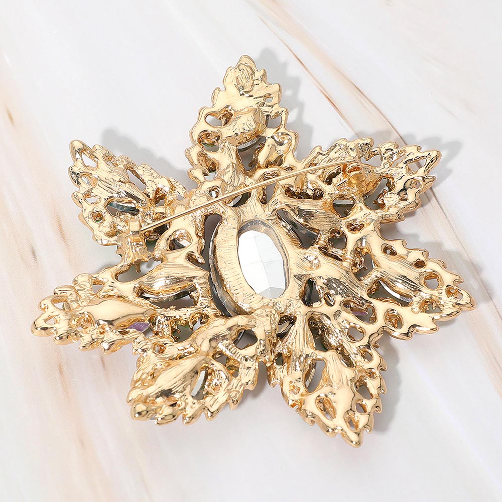 • This ornate floral brooch features an intricately layered design with a bold faceted centerpiece surrounded by shimmering accents. Its radiant, sculpted silhouette adds a refined touch to formalwear, evening outfits, or special-occasion ensembles, creating a timeless statement full of sophistication.
