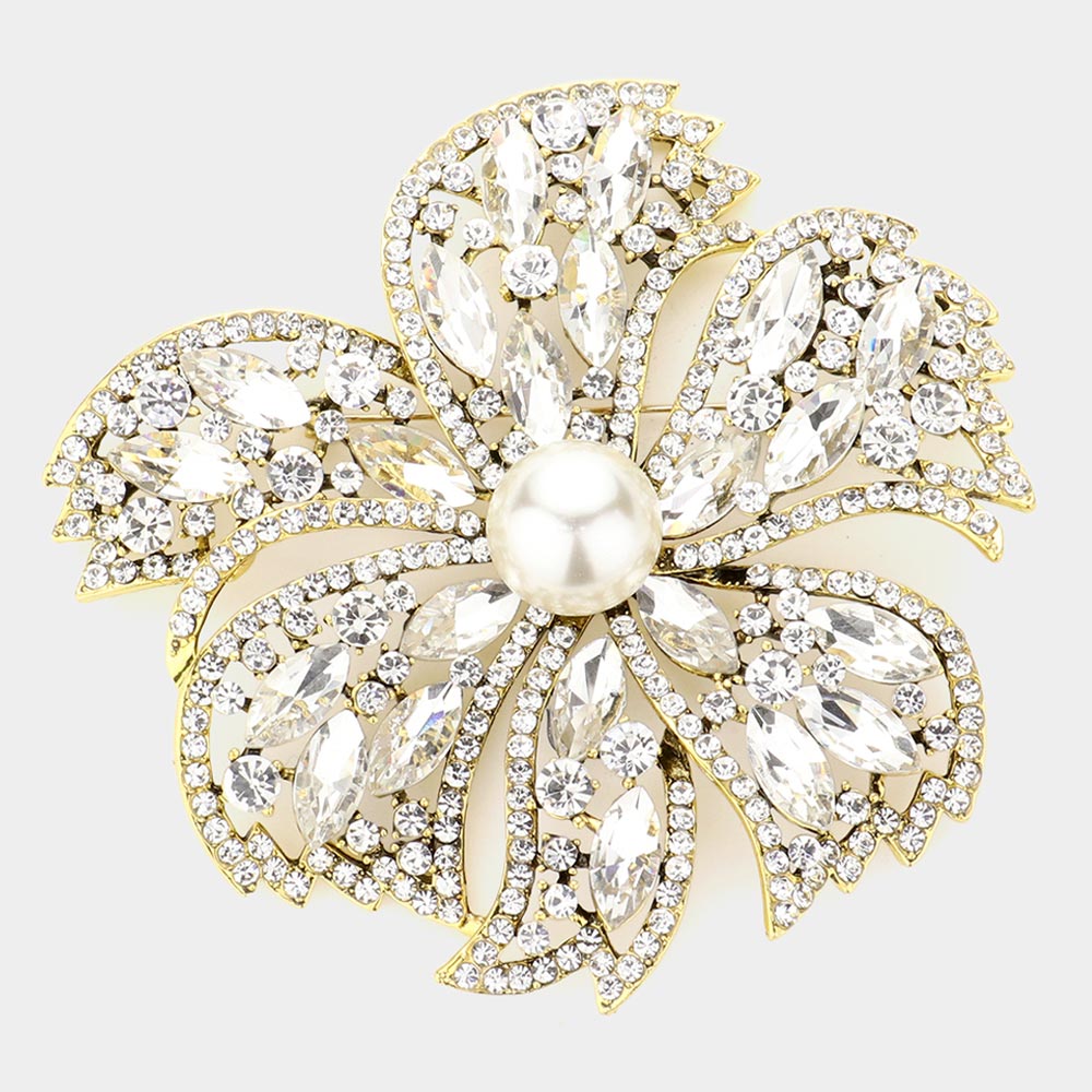 Pearl Pointed Stone Embellished Oversized Flower Pin Brooch