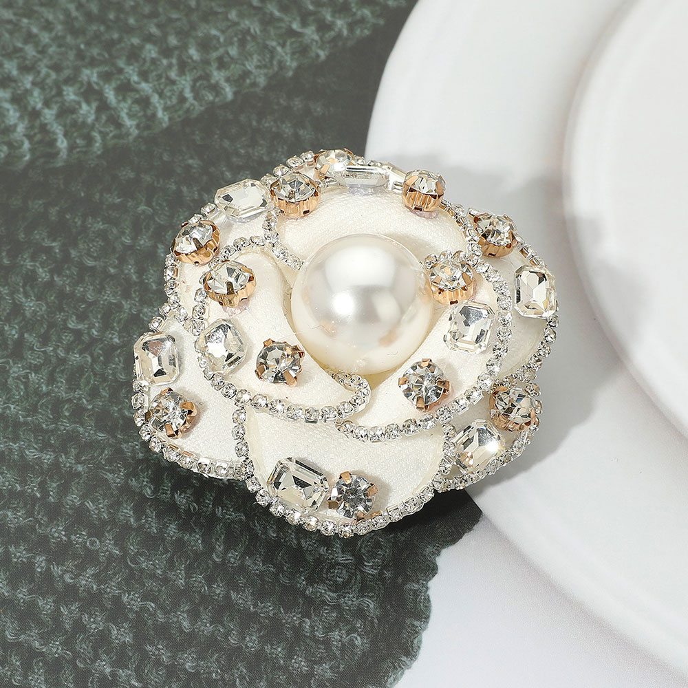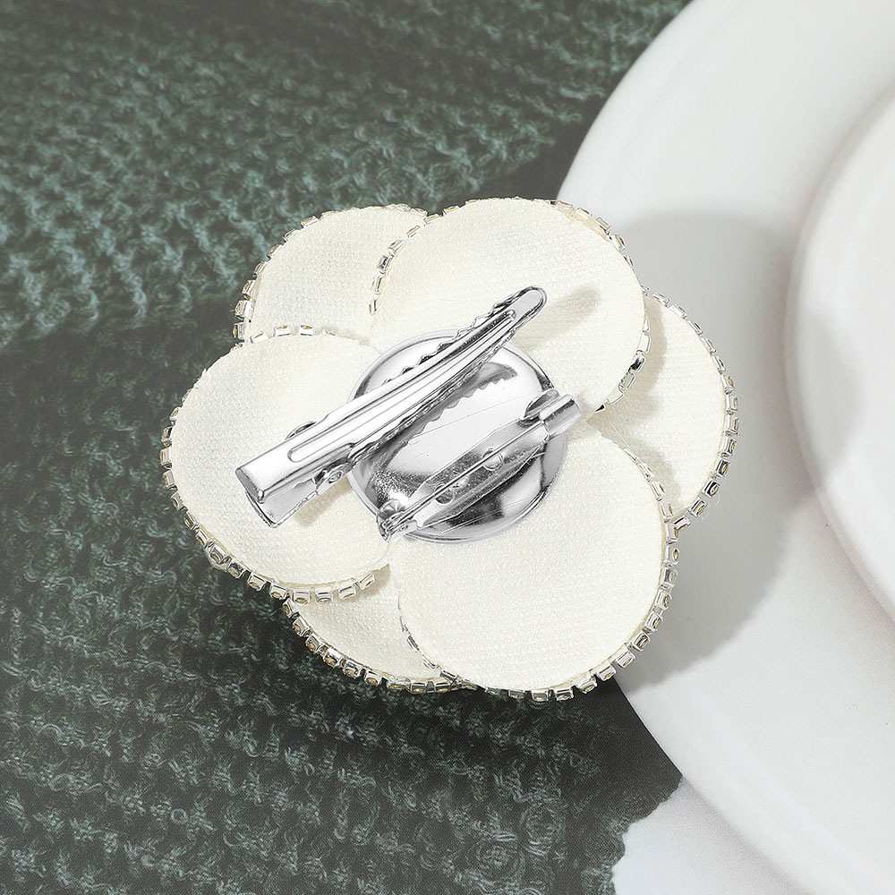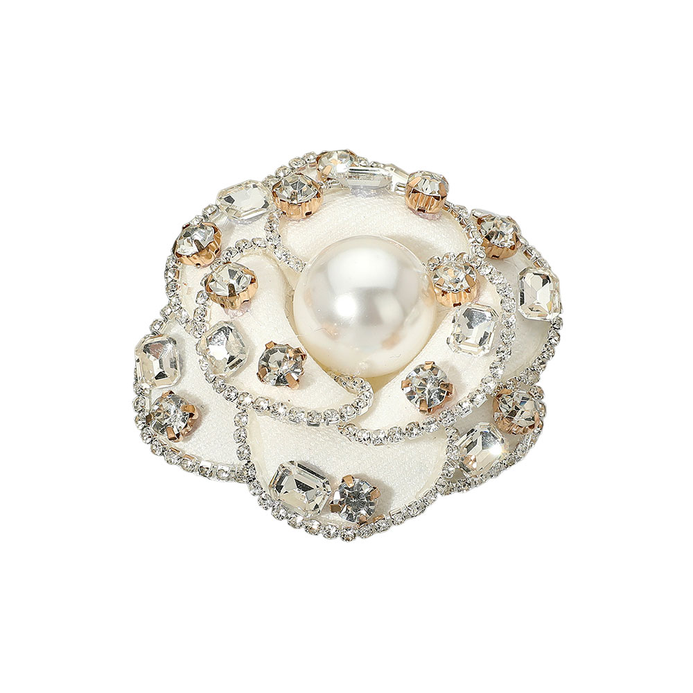 Details • Size : 2.25" X 2.25" • Dual : Brooch / Hair Pinch Clip • Luxurious flower brooch adorned with sparkling crystals and a central pearl accent, featuring a dual clip for versatile styling. Perfect for enhancing jackets, dresses, scarves, or handbags with elegance. • Lead and Nickel Compliant