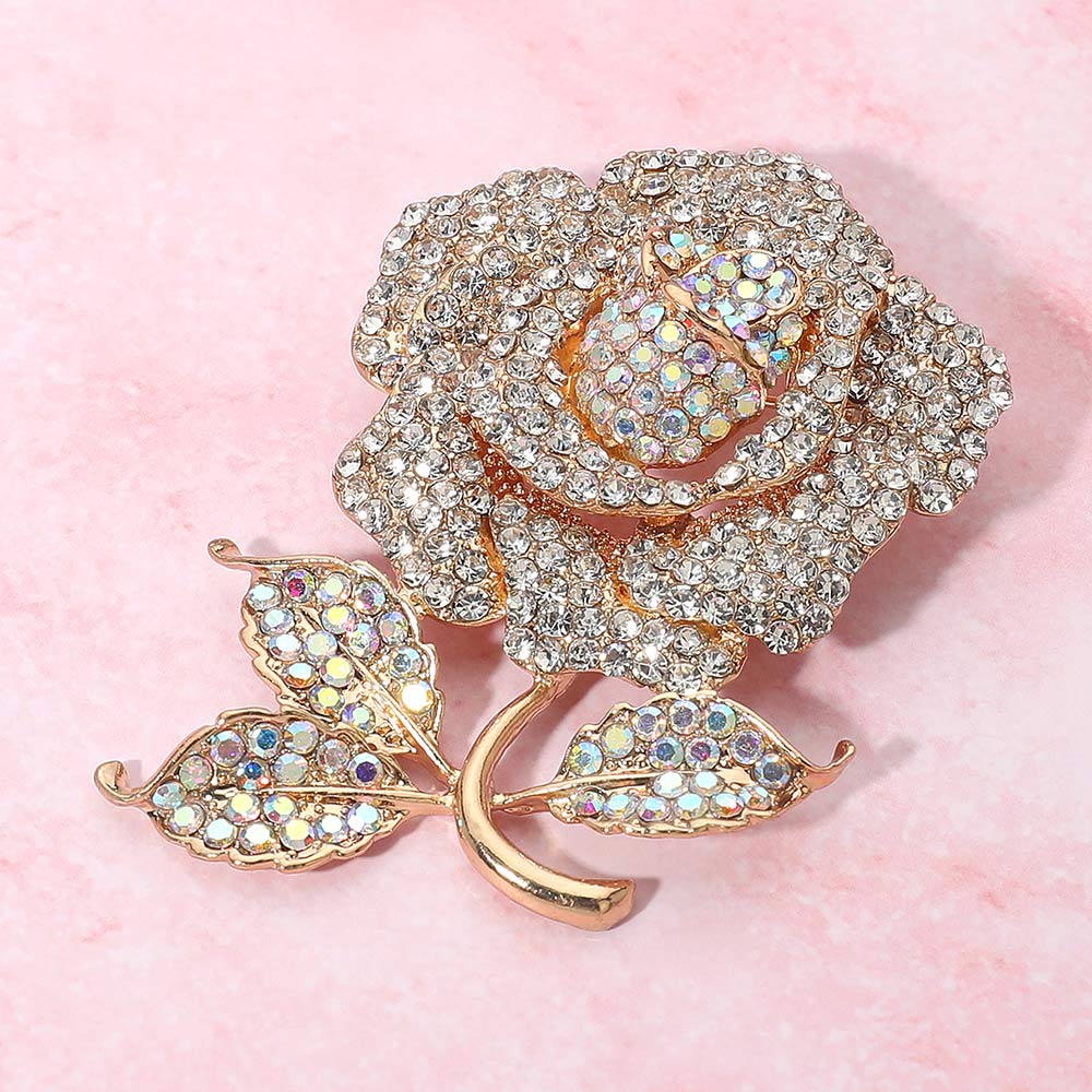 Details • Size : 2.25" X 3" • Pin Brooch • Add a touch of romance and sparkle with this crystal rose brooch, beautifully designed with shimmering stones for a radiant look. Perfect as a statement accessory on jackets, dresses, scarves, or handbags, this floral pin is ideal for weddings, special occasions, or as a thoughtful gift for someone special. • Lead and Nickel Compliant