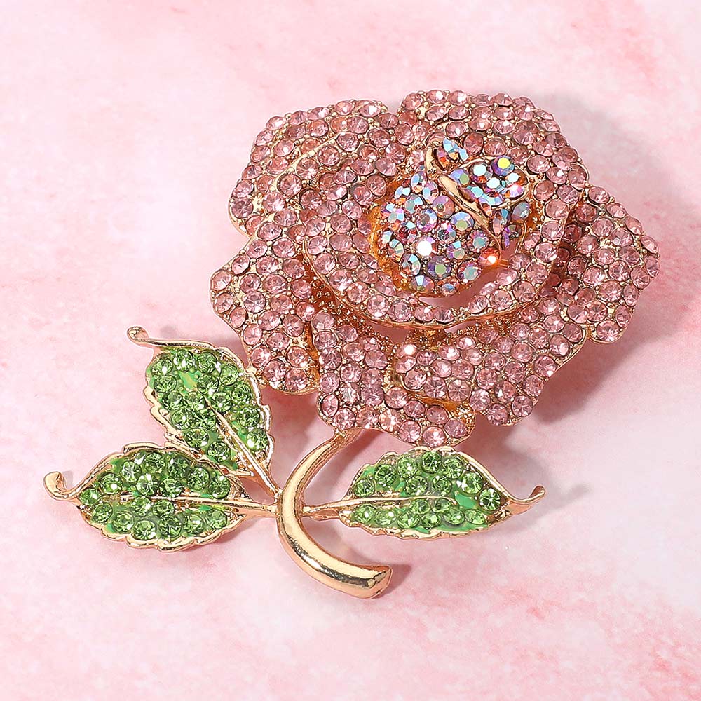 Details • Size : 2.25" X 3" • Pin Brooch • Add a touch of romance and sparkle with this crystal rose brooch, beautifully designed with shimmering stones for a radiant look. Perfect as a statement accessory on jackets, dresses, scarves, or handbags, this floral pin is ideal for weddings, special occasions, or as a thoughtful gift for someone special. • Lead and Nickel Compliant