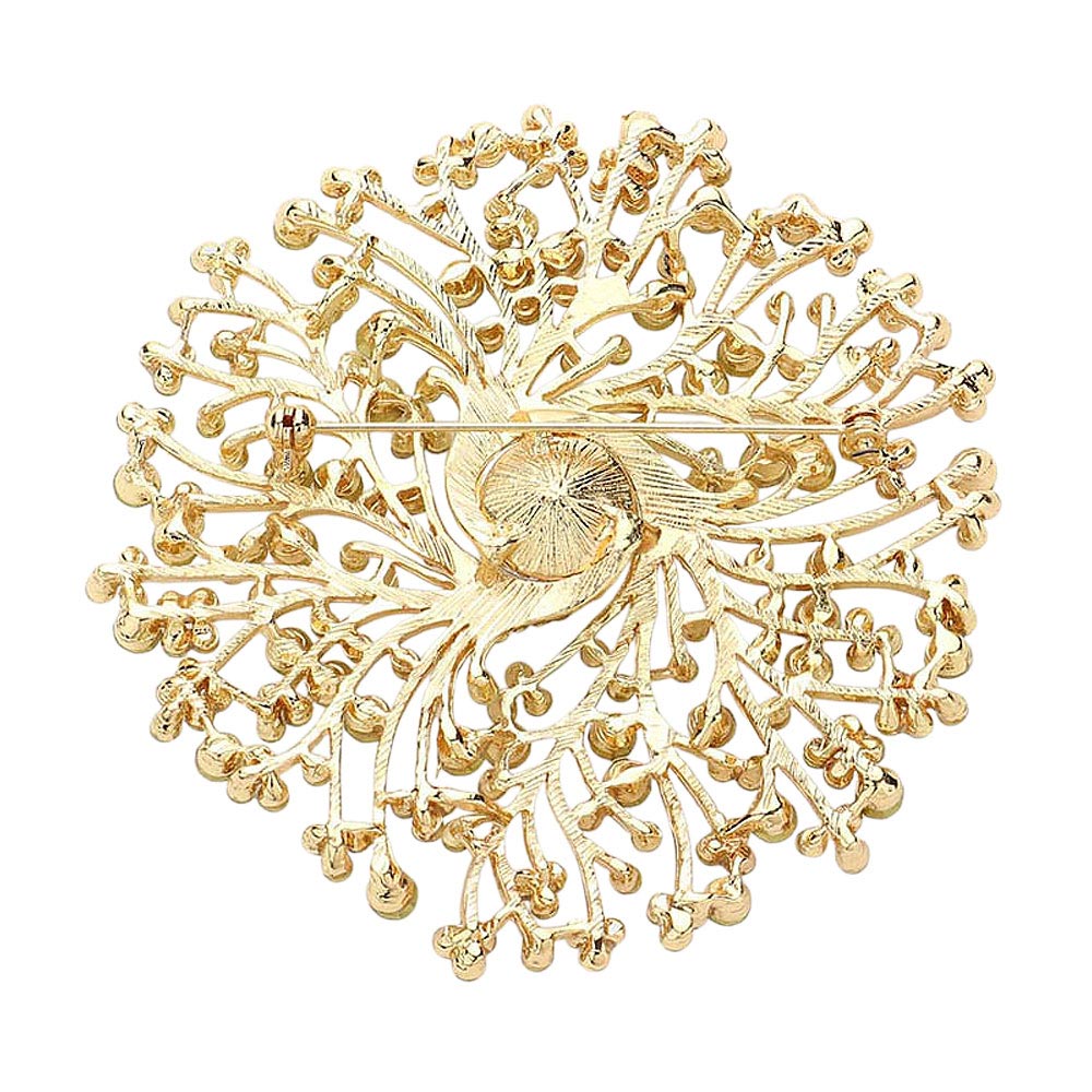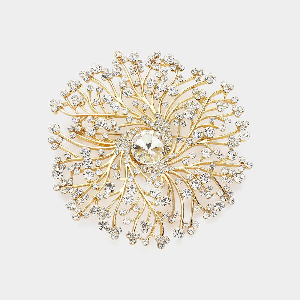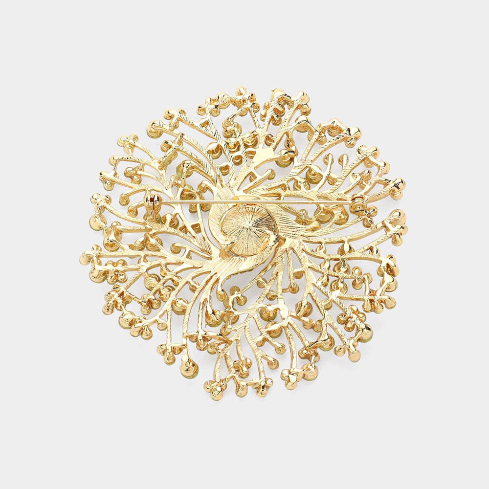 Round Stone Centered Rhinestone Embellished Branch Flower Pin Brooch