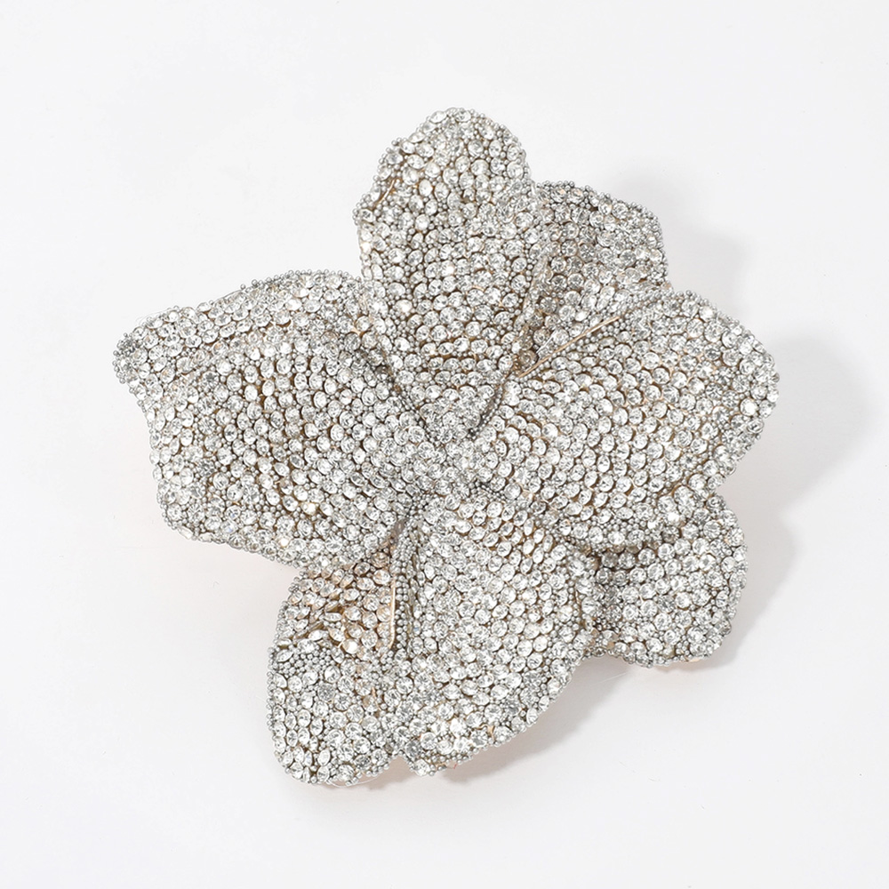 Details • Size : 3.4" X 3.25" • Dual : Pin Brooch / Alligator Snap Hair Clip • Elegant rhinestone flower accessory with a dual-use design as both a brooch and hair clip. Embellished petals and a glossy pearl center create a luxurious accent for any outfit. Ideal for special occasions, events, or daily glam. Secure clasp for comfortable wear all day. • Lead and Nickel Compliant