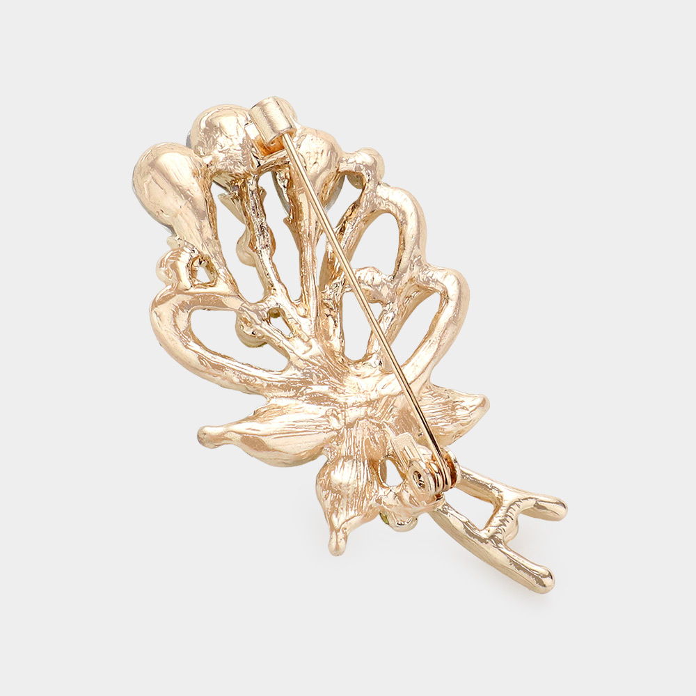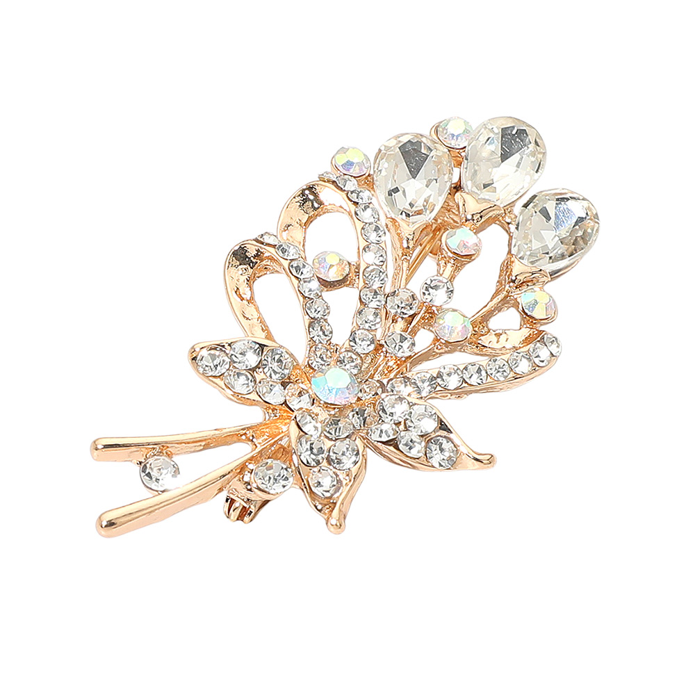 Details • Size : 2.2" X 1.2" • Pin Brooch • Elegant floral spray brooch featuring a sparkling crystal-inspired design with layered petal details and radiant accents. A refined statement accessory that adds vintage charm and eye-catching brilliance to jackets, dresses, scarves, bags, and special occasion styling. • Lead and Nickel Compliant