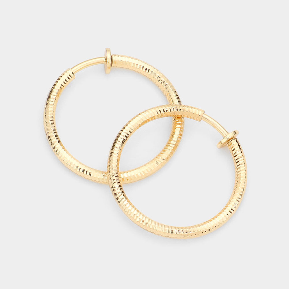 2.4 Inch Textured Metal Clip On Hoop Earrings