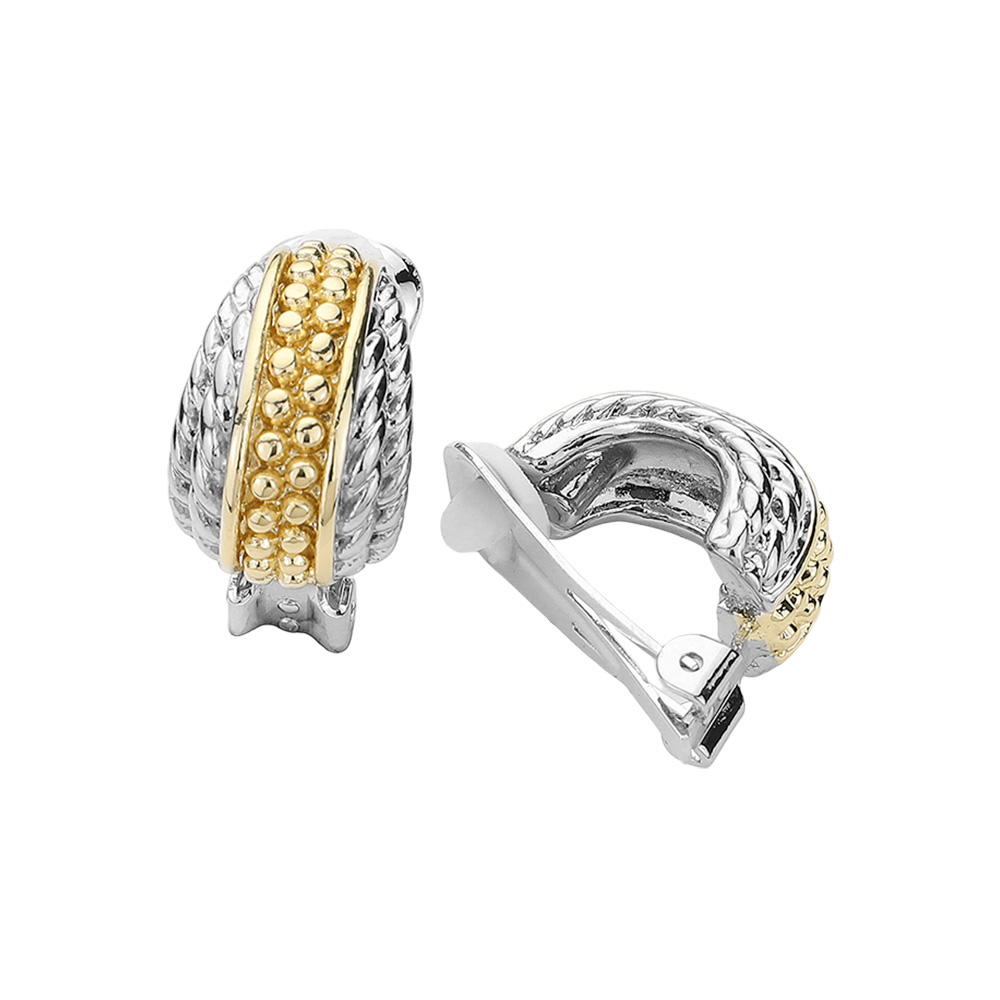Details • Size : 0.7" X 0.8" • Clip On • Add a bold yet elegant touch to your look with these textured clip-on hoop earrings featuring intricate detailing and a striking dual tone design. Ideal for non-pierced ears, they offer both comfort and sophistication for any occasion. • Gold Dipped