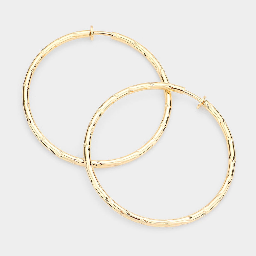 2.4 Inch Textured Metal Clip On Hoop Earrings